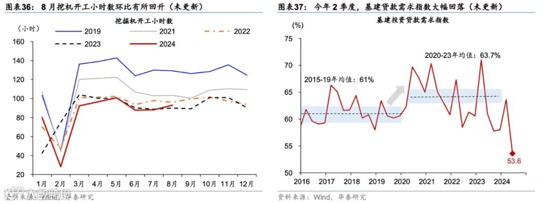 8月挖机开工小时数有所回升,但仍低于2019-2022同期水平。挖机开工时长的变化能够反映建筑业的施工强度,是基建与房地产业的晴雨表。8月挖掘机开工小时数较7月环比回升4.8小时至93.0小时/月,较往年同期仍偏低,显示建筑业施工强度仍有进一步回升空间(图表36)。