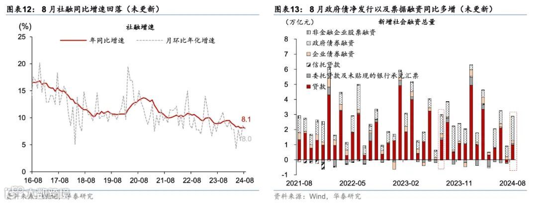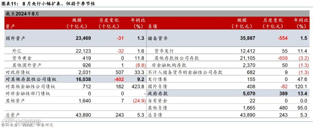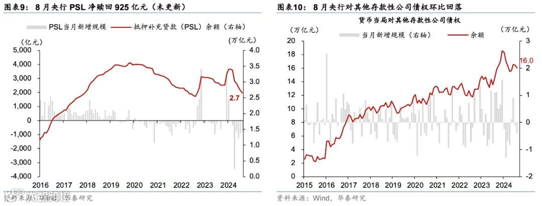 8月央行基础货币同比少增1.1万亿元,显示货币政策偏紧,但随着9月27日降准降息生效,货币政策立场边际宽松。8月央行基础货币余额环比下降5,539亿元,同比少增1.12万亿元,显示多重目标下货币政策偏紧。在央行的资产端,8月央行对其他存款性公司债权余额下降4,025亿元,而去年同期环比上升1.1万亿元(图表11);同时,随着央行开展公开市场国债买卖操作,8月央行对政府债权环比增加5,071亿元,可能是央行买入国债的总规模,而央行公告的净买入国债规模为1,000亿元。