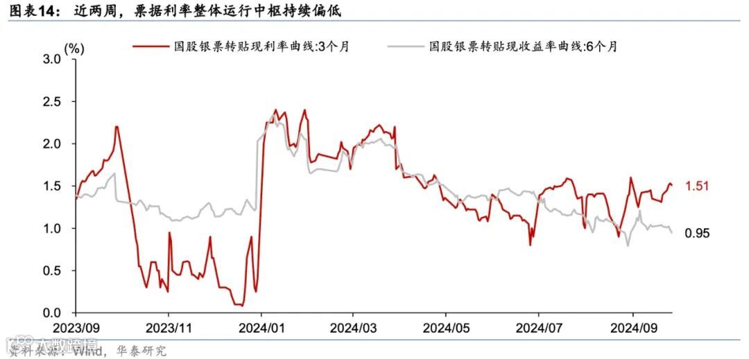 近两周,票据利率继续低位运行,显示实体经济融资需求仍待修复。近两周,3个月票据利率小幅回升至1.51%,而6个月票据利率回落至0.95%的较低水平,票据利率整体运行中枢持续偏低,或反映企业融资需求仍偏弱(图表14)。