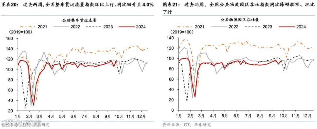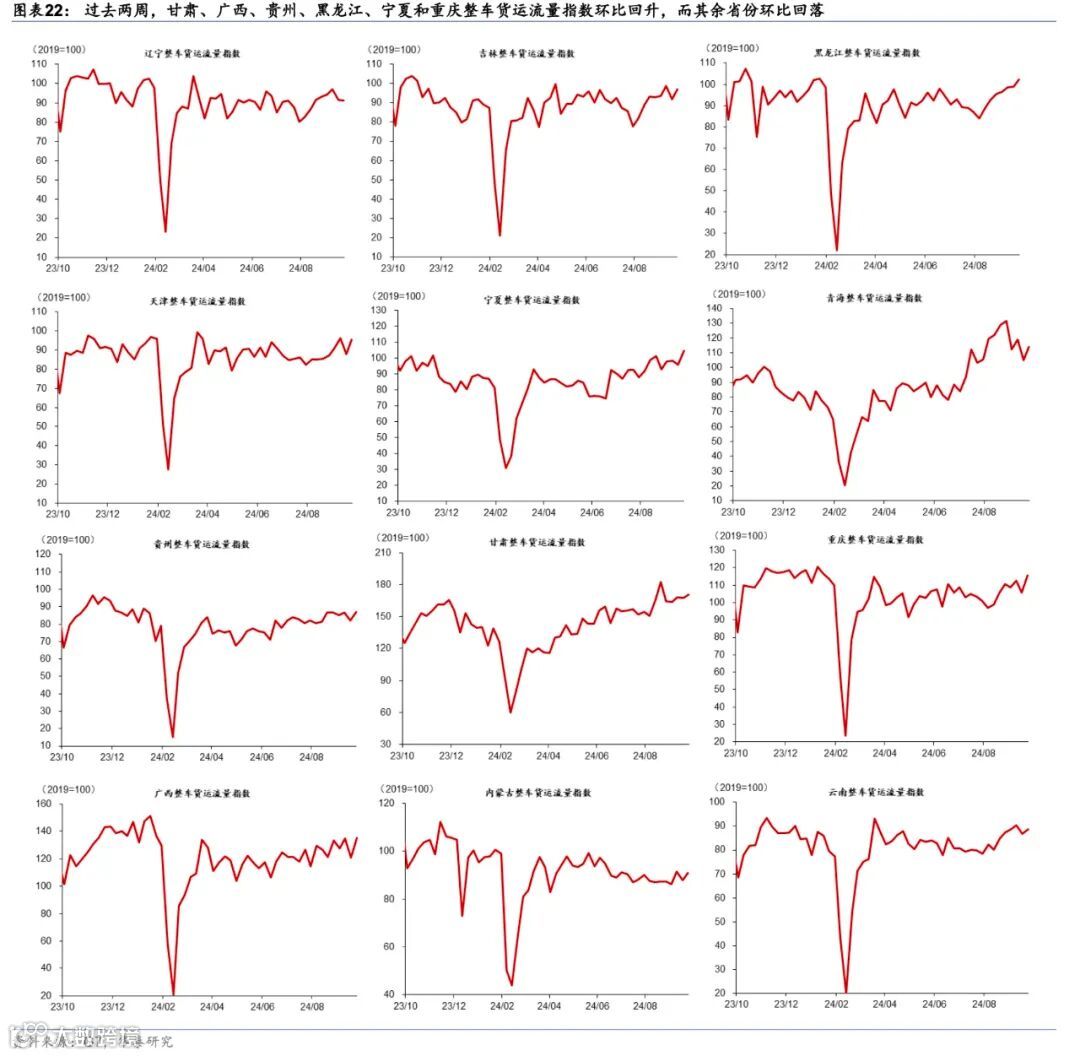 近两周,全国公路整车货运流量指数环比上行,同比增速从两周前的0.2%回升至4.0%,其中重点省份物流指数走势持续分化。过去两周,公路整车货运流量指数环比上行1.0%、同比回升至4.0%。同时,公共物流园区吞吐景气指数较两周前环比下行1.2%,但同比降幅收窄至1.2%(图表21)。分省看,甘肃、广西、贵州、黑龙江、宁夏和重庆整车货运流量指数环比回升,而其余省份环比回落(图表22)。