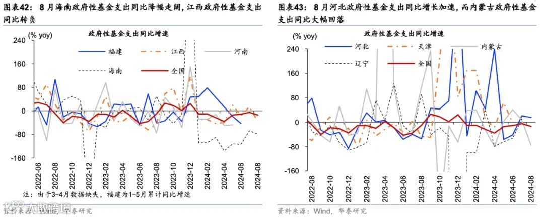 8月全国政府性基金支出仍待提速,其中部分重点化债省份表现弱于全国。高基数下8月全国政府性基金支出同比降幅从7月的5.0%走阔至14.0%,而两年复合增速从7月的-21.9%小幅回升至-12.1%。在重点化债省份中,河北政府性基金支出同比增速回升,而内蒙古、江西和海南政府性基金支出同比增速回落,且均低于全国平均水平。