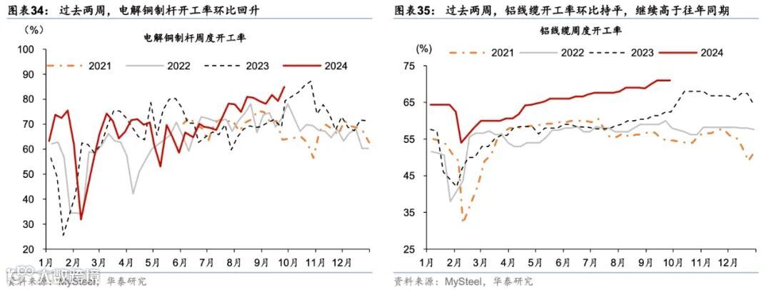 过去两周,电解铜制杆环比回升,铝线缆开工率环比持平,均继续高于往年同期水平。电解铜制杆和铝线缆主要应用于电网建设,可以反映电网投资的落地情况。电解铜制杆开工率近两周累计上行3.2个百分点至84.9%,高于去年同期5.5个百分点;铝线缆开工率为71.0%,环比持平,且持续高于往年同期水平(图表34和35)。
