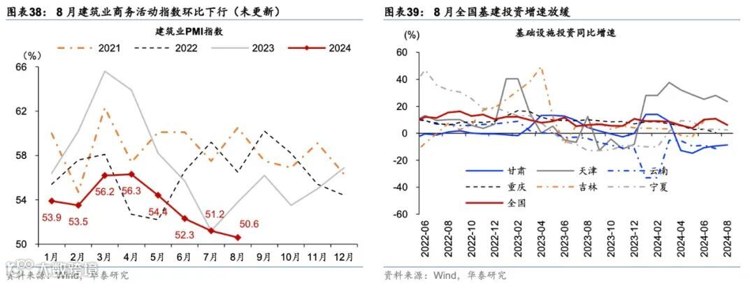8月全国基建投资增速放缓。8月全国基建投资同比增速从7月的10.8%回落至6.2%,两年复合增速亦从7月的8.0%回落至6.2%,可能主要受全国高温多雨天气拖累。我们计算基建投资的口径亦包括电力、热力、燃气及水生产和供应业。在已公布数据的重点化债省份中,今年前8个月天津基建投资累计同比增速高于全国,而甘肃和宁夏均低于全国(图表39)。