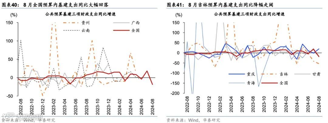 8月全国预算内基建支出同比大幅回落,其中部分重点化债省份增速高于全国。8月全国预算内基建支出同比增速从7月的18.2%转负至-18.7%,两年复合增速亦从7月的8.4%明显回落至-6.6%。在重点化债省份中,已公布数据的省份包括重庆、甘肃和吉林,三省的加权平均预算内基建支出同比增长10.2%,高于全国平均增速(图表40-41)。