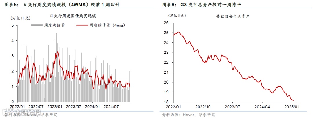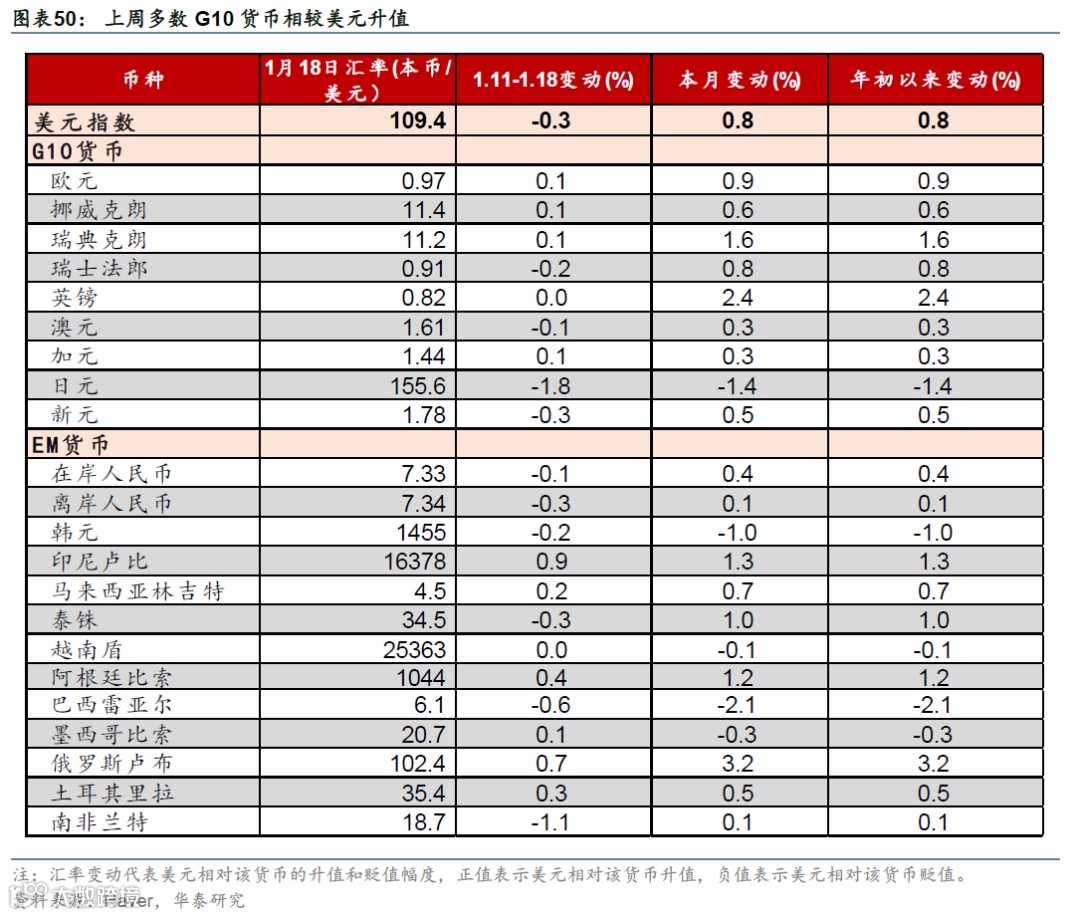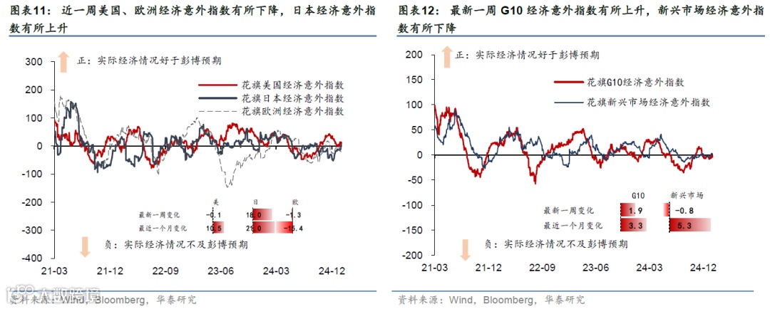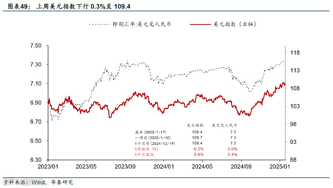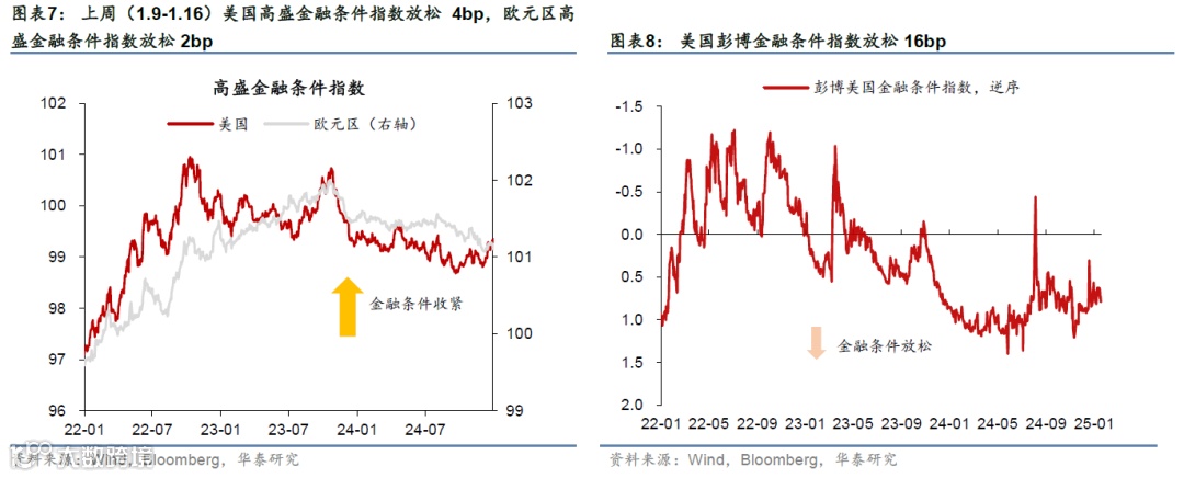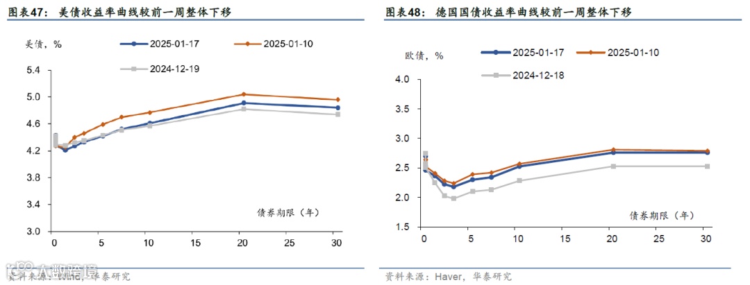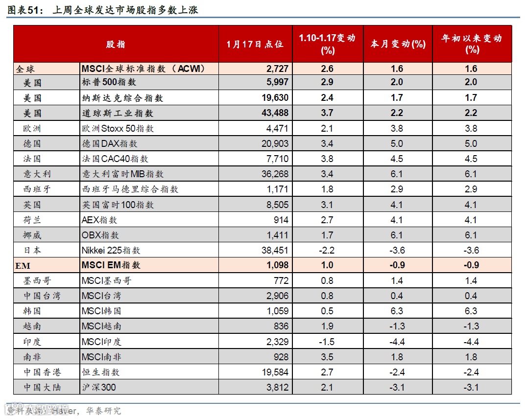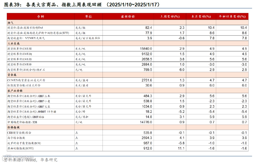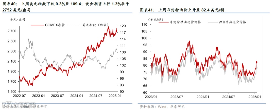 美国12月核心CPI不及预期,缓解了市场对通胀的担忧;12月零售数据维持稳步增长。上周特朗普内阁成员先后在听证会上对美国对外战略、关税、财政政策等关键问题发言;中美首脑通话。市场对联储降息预期下降,美元指数和美债收益率均下行,美股上涨,油价和金价上行。本周关注特朗普就职典礼(1月20日)、美欧日12月PMI(1月24日)、日央行议息会议(1月23-24日)。