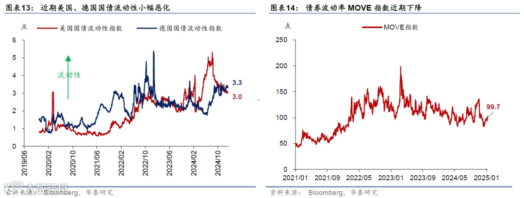 美国核心CPI不及预期提振降息预期,美债收益率和美元下行,美国三大股指均收涨,大宗商品也普遍上涨。2年和10年期美债收益分别下降13bp/16bp至4.27%/4.61%,曲线变平;2025年联储降息预期由30bp升至38bp。同期,美元指数下行0.3%至109.4;欧元贬值0.1%至1.03;日央行1月加息预期升温,日元升1.8%至155.6。美国三大股指均上涨,道指、标普500、纳指分别上涨3.7%、2.9%、2.4%。大宗商品普遍上涨,COMEX黄金期货上涨1.3%至2751.6美元/盎司;布伦特原油期货上涨2.3%至82.4美元/桶;LME铜现货上涨1.5%至9132美元/吨。