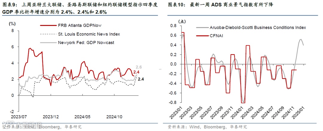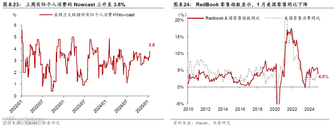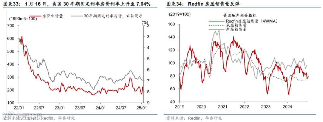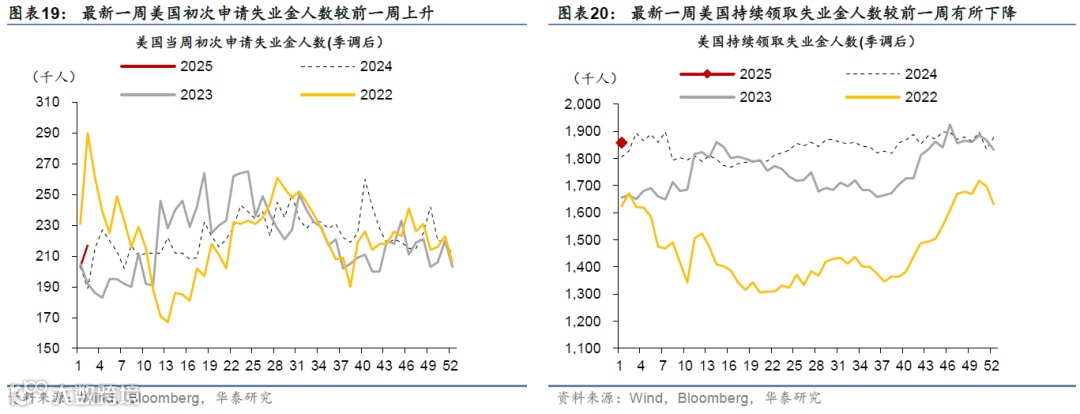 高频数据显示美国消费维持韧性,但劳动力市场有所降温,房贷利率上行、住房需求持续偏弱。消费方面,上周实际个人消费的Nowcast上升至3.8%,反映美国消费韧性仍偏强。就业市场方面,上周首申人数超预期上升1.4万人至21.7万人,或表明就业市场有所降温。地产方面,30年期固定利率房贷利率上行至7.04%的高位,房地产待售时长延续上行趋势、Redfin房屋销量边际改善、但仍处于低位,房地产市场仍然承压。