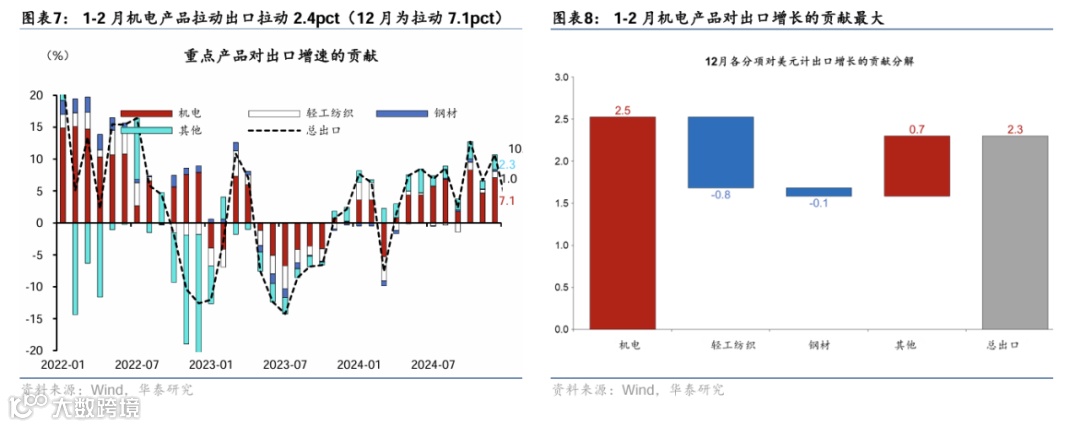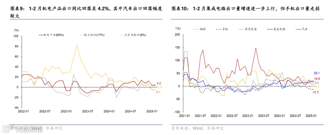 分产品看,1-2月机电产品增速走弱,对出口增长的贡献降至2.5个百分点,但其中电子链增速有所上行;轻工纺织等产品出口同比增速降幅较大,或由于美国消费边际走弱;汽车和钢材均呈现“以价换量”的特征。 具体看: