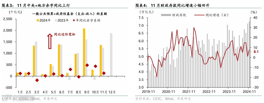 11月广义财政(一般公共预算+政府性基金)支出同比增速较10月的20.4%放缓至4.6%、仍位于年内相对高位,9-11月合计同比增速录得11.8%的高增长、显示9月以来的稳增长政策持续发力,较3-8月财政支出有明显提速,或对四季度名义GDP增长形成提振;同时,广义财政收入同比增速在高基数下从10月的2.4%回落至0.9%,税收收入增速持续改善,而土地出让收入降幅走阔有所拖累。整体而言,11月广义财政(一般公共预算+政府性基金)赤字录得1.36万亿元、较去年同期多增1320亿元、显示财政延续温和扩张态势。财政存款从10月的1%回升至8.1%,或受到置换债大规模发行的影响,11月中旬以来,各地密集发行用于置换存量隐性债务的再融资专项债,全月发行约1.16万亿元。