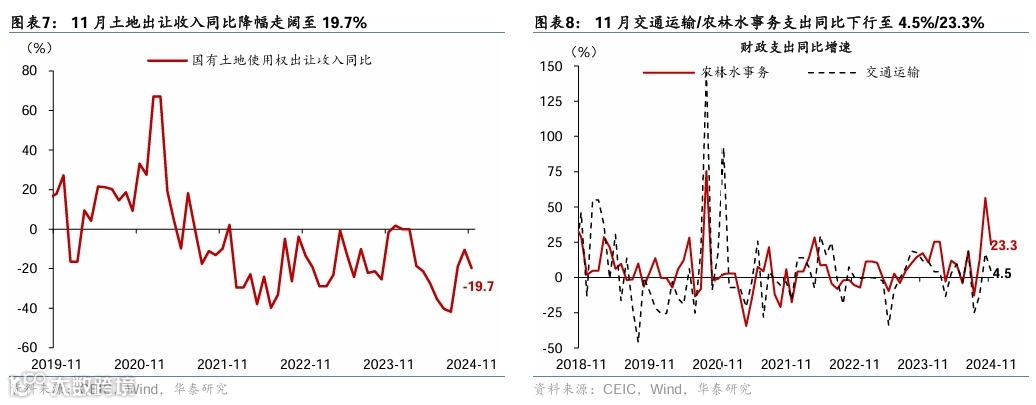 11月一般公共预算支出和政府性基金支出同比增速均高位放缓,但仍高于3-8月广义财政支出的平均增速-4.6%,显示“9·24”以来财政支出整体提速、广义财政边际扩张。具体看,11月一般公共预算支出同比增速从10月的10.4%回落至3.8%,分类别中基建相关的农林水事务/交通运输/节能环保分项的同比增速分别从10月的56.4%/16.9%/0.6%回落至23.3%/4.5%/-3.1%,可能反映建筑施工进入淡季、基建项目落地速度有所放缓。此外,与民生相关的社会保障和就业、卫生健康支出的同比增速分别从10月的16%/17.7%回落至14.9%/-17.1%,稳增长政策在稳民生和稳就业等领域仍待进一步发力。政府性基金支出同比增速较10月的47.9%高位放缓至6.3%,两年复合增速亦较10月的31.9%回落至4%,可能反映年内新增专项债额度用罄,资金效应对政府性基金支出的支撑作用有所退坡。