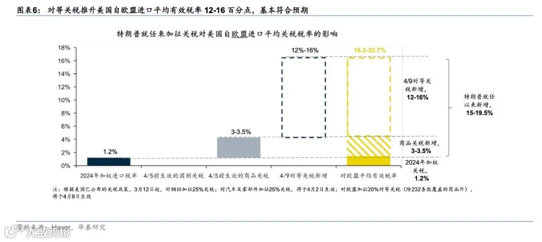 4. 美国对欧洲加征20%的对等关税,符合我们的预期及计算公式。虽然税率相比其他不算最高,但因为欧盟是美国第一大贸易伙伴,也将产生较大的收缩性影响和效率损失。如我们在《“对等”关税:几点预判和量化分析》,2025/3/31中分析,欧盟可能是对等关税的最大加征目标,预计美国对欧盟进口商品的关税可能达到15-25%。据公布的对等关税税率,预计本次加征对等关税推升美国自欧盟进口平均有效税率12-16百分点,加上此前的商品关税美国自欧盟进口平均有效税率或上升至16.2-20.7%(图表6)。