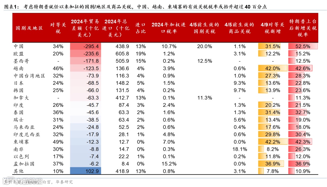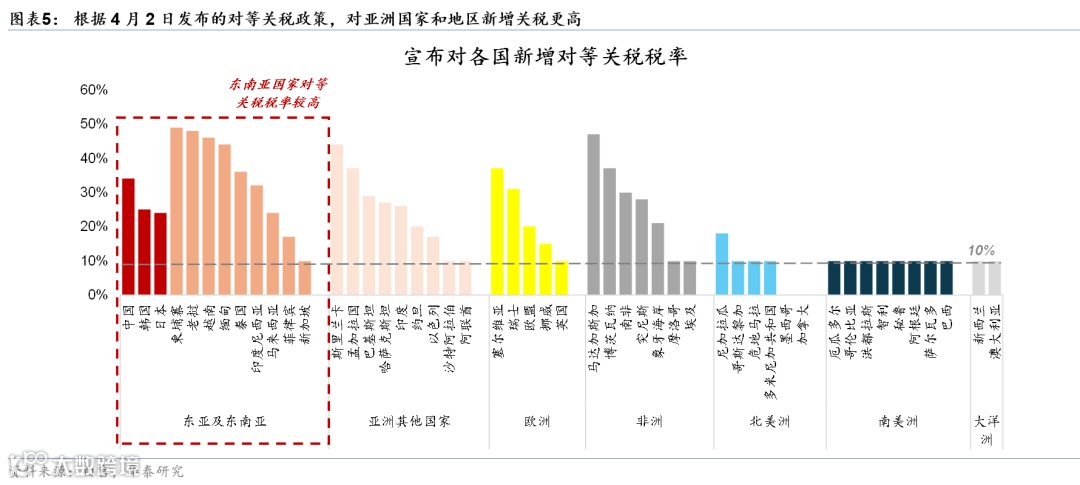3. 美国对美洲的对等关税税率总体较温和,而对亚洲国家加税水平更高。具体看,美国对加拿大、墨西哥没有进一步加征对等关税,而对中国进一步加征34%、即今年以来累计加征54%,对日本、韩国分别加征24%、25%,且多个东盟国家被加征40%以上的对等关税(如越南46%、缅甸44%、柬埔寨49%,图表5)。