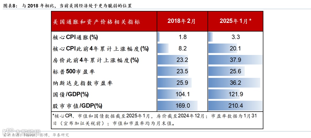 3. 税率明显上升以及全球、尤其美国经济面临更大下行压力。中国出口可能面临比1季度、甚至2018-19年贸易摩擦升温期间更大压力。今年1-2月中国出口同比增速达2.3%、而经工作日调整后的出口增速维持在7.6%的高位,3月受季节性因素推动,港口集装箱吞吐量仍维持较高增长,华泰出口需求日度指数(HEDT)显示4月同比或录得约4%,显示整体1季度出口仍有一定韧性。复盘2018-19年中美贸易摩擦期间,美国对中国的平均关税水平从2018年1-6月的3%左右攀升至13%左右,而2019年人民币兑美元汇率较17年均值下行约2.3%,2019年末人民币兑美元汇率较2017年末下行约7%。同时,出口退税补贴等政策亦推动2019年出口退税额亦较2017年增长20%,由此,总量层面部分抵消了关税对中国出口的负面影响,但此次上述对冲性政策暂未体现。此外,更重要的是,全球经济、尤其美国经济处于更为脆弱的位置(图表8)。上一轮2018年加征关税前,美国经济受益于特朗普的大规模减税,经济增长在潜在增速之上,而此次减税规模或有限,且今年1季度美国实际GDP季环比折年增速可能放缓至1-1.5%的水平。同时,当前美国的物价水平远高于2018年,而关税政策可能进一步抬升美国的通胀预期。