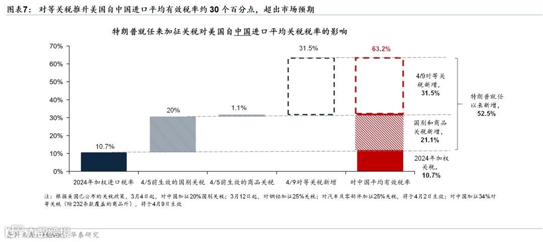 1. 此次中国被加征税率本身高于预期。2018-19年间,美国对约2/3的中国出口商品加征关税,对美出口商品加权平均关税约为12-13%(被加征商品税率接近20%)。随着美国加大对中国出口商品的豁免,截至2024年,中国对美出口商品的加权平均关税约为10.7%。而今年以来,美国先后对中国加征54%的关税,即便考虑美国此次暂未对钢铝、汽车、药品、半导体、铜及木材进一步加征关税的影响之后,目前美国对中国出口加征关税的税率可能高达63%,即较2024年上升52个百分点(图表7)。