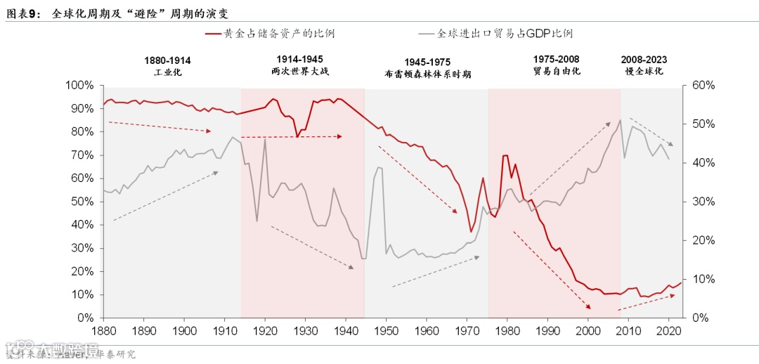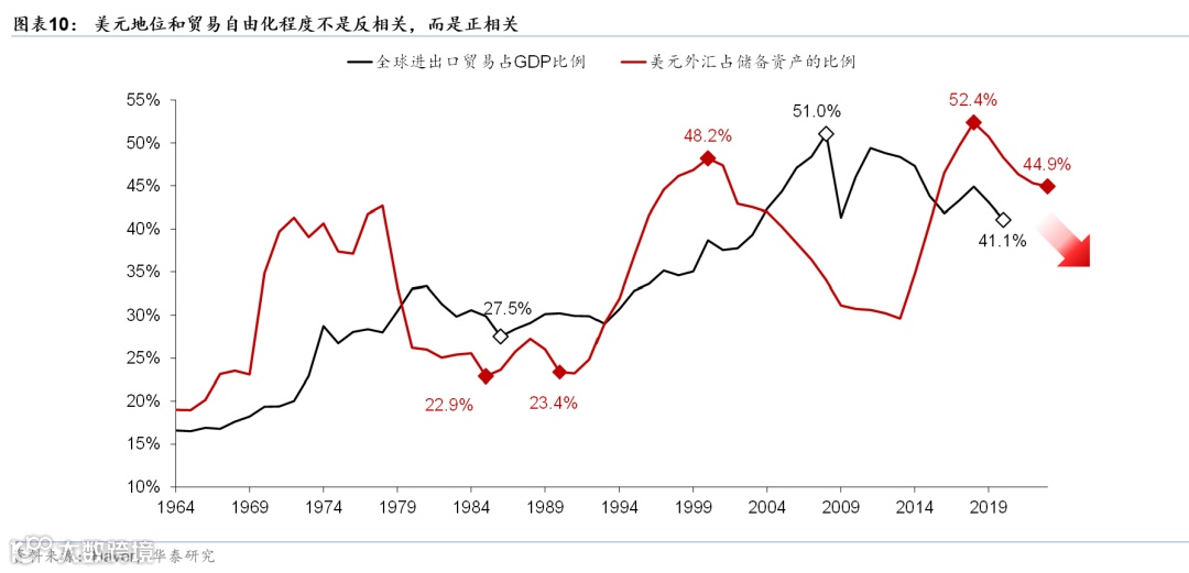 7. 全球贸易萎缩加快全球去美元化速度,美元和美元资产估值溢价可能更快收缩。由于2020-24年持续享受资本流入,当前美元指数较过去十年均值高出约3.5%。同时,纳斯达克指数市盈率较2018年2月中美贸易摩擦升温前高出近40%,而相对10年期美债利率的风险溢价亦大幅压缩至-1.6%的历史低位,均在一定程度上受益于美元作为储备货币的地位。从历史上看,美元占全球储备的比例和全球贸易占GDP的比例呈正相关关系(图表9和10)。如果全球贸易明显萎缩,可能会降低全球对美元的需求。同时,目前美元及美元资产享有估值溢价,很大程度上受益于美元作为储备货币的地位。如果美国关税政策反复导致美国政策公信力下降,可能会降低美元和美元资产的安全属性,压缩其估值溢价。
