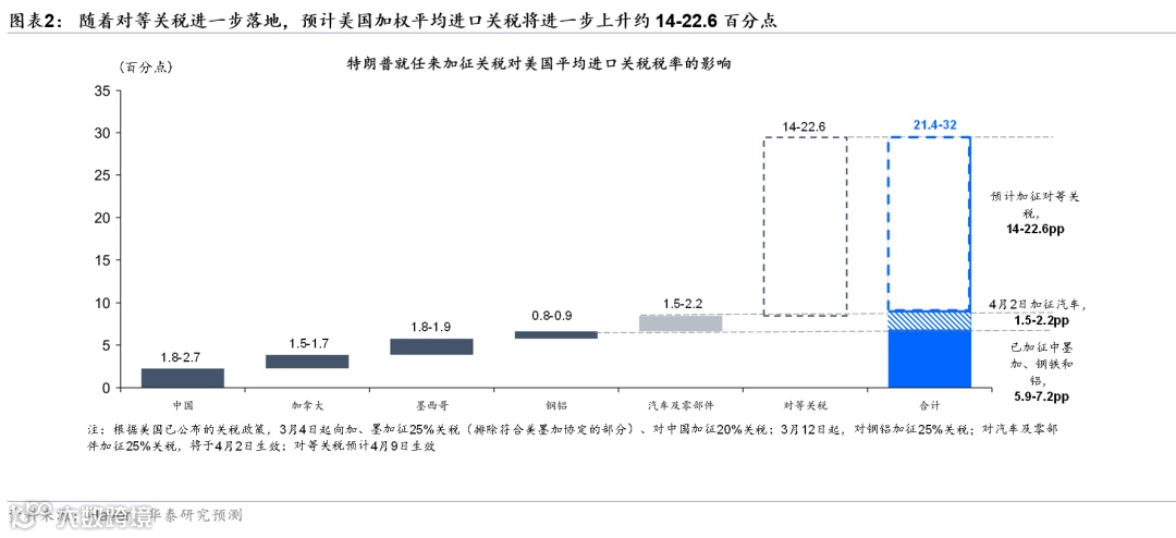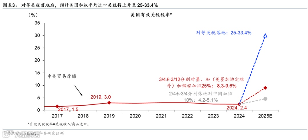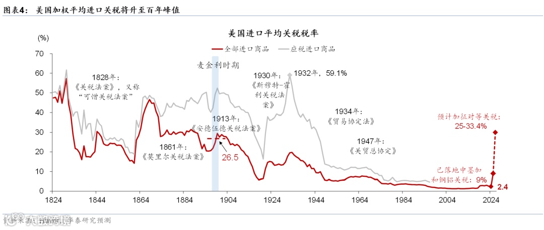 1. 本次对等关税涉及国家范围及税率均大幅超出市场预期,若全部落地,美国加权平均进口关税水平可能达到25-33%,接近、甚至超过1919年的、近代世界贸易史上的最高水平——至少特朗普政府将谈判的起点锚定于此。基于-1.2~0的进口弹性系数测算,如果对等关税落地,美国加权平均进口关税水平将上升14-23个百分点至25-33%的历史高位(图表2-4)。虽然现在对等关税不包括药品、半导体、铜、木材等商品,但此后可能根据232 调查结果再加征关税,所以虽然这个是谈判的起点,美国给一些国家留有谈判空间,但理论上,美国加权平均进口关税水平也可能进一步上升。