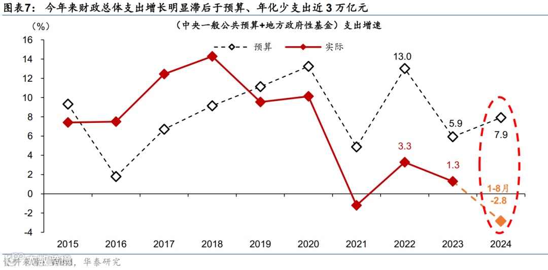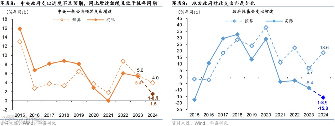 如何评判政策效果?我们维持此前的框架,首先,我们将观察社融增长、尤其是票据外的社融增长是否有效回升,同时,我们将关注财政支出增长速度来判断财政是否有效宽松。此外,地产成交是否明显回升,是判断居民通胀和收入增长预期是否明显修复的有效“风向标”之一。近期国内金融数据显示政府债及票据以外的信贷需求偏弱,或体现真实利率偏高拖累实体经济自发性融资需求,尤其是居民提前还贷现象升温,亟需货币和财政政策快而有力的协调和配合来阻断物价下行预期、稳定增长预期。而今年1-8月中央+地方广义财政支出同比-2.8%,距年初确定的全年增长7.9%的目标有一定差距,简单匡算今年1-8月年化财政支出与预算的缺口约3万亿左右(图表7-9),中央+地方财政支出增速明显低于名义GDP增长,显示财政政策实质执行层面偏紧缩态势,与年初人大预算和4月、7月政治局会议阐述的财政宽松的初衷有一定偏差,短期内,增加预算赤字或增发国债的可能性和必要性或有上升。除社融及财政支出的改善外,地产成交及开发商融资等数据亦值得重点关注。