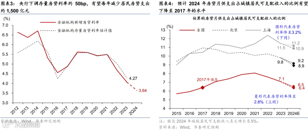 此外,央行下调存量房贷利率约50个基点至新发房贷利率水平,有望边际缓解提前还贷压力并减少居民刚性支出。2022年以来,随着新增房贷利率快速下调,而存量房贷利率调整滞后,存量房贷利率明显高于新增房贷利率。据央行2023年4季度货币政策执行报告披露,2023年调整后存量房贷利率平均加权利率为4.27%(图表3)。而到今年2季度,新增房贷利率已降至3.45%的低位。调降存量房贷利率有望每年减少居民房贷支出约1,500亿元,约占居民房贷总支出的4-5%,占城镇居民可支配收入和年度社零的比例均约0.3%,以3.2%的房贷利率进行估算,预计2024年全年房贷月供支出占城镇居民可支配收入的比例有望下降至与2017年相当的6.5%左右(图表4)。