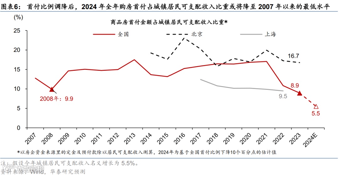本次首付比例下调后,房贷支出占城镇居民可支配收入有望降至2017年左右水平、首付占收入比例或将降至历史最低水平。具体看,以房贷利率水平降至3.2%左右的水平估计,我们估算房贷支出占城镇居民可支配收入有望降至2017年6.5%左右的水平;基于全国首付比例下降10个百分点进行测算估计,首付占收入比例亦或将从2023年的8.9%降至历史最低水平5.5%,进一步增强居民购房负担能力(图表6)。
