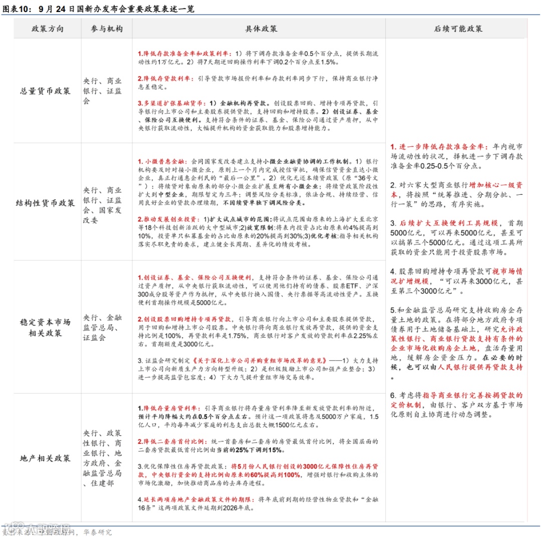 结构性政策层面,稳定资本市场(创立非银机构互换便利及回购再贷款)、提振地产需求、缓解开发商现金流压力、以及支持小微普惠金融方面均有新的宽松举措。其中,创立股票回购增持再贷款,统一首套和二套房首付比例至15%等政策的边际效果可能更为明显。具体看,