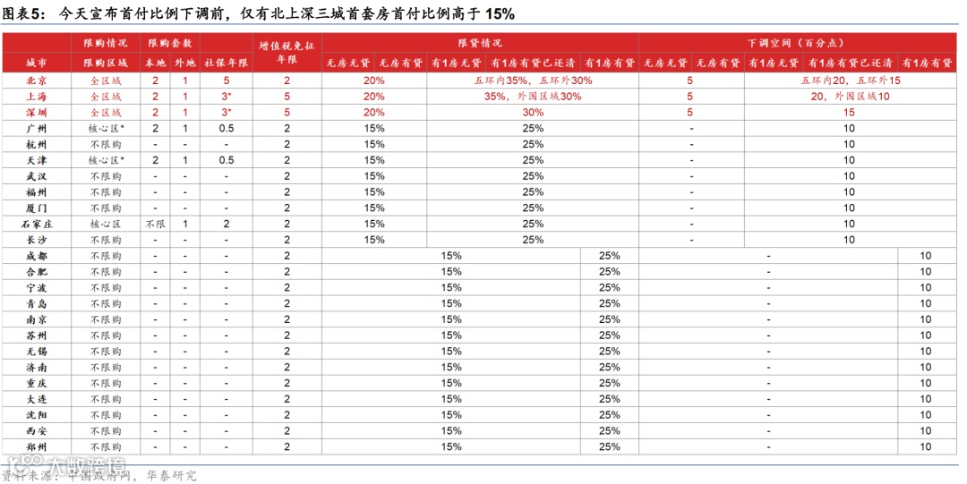继“5.17地产政策组合拳”对首套及二套房的首付比例从20%和30%、分别下调5个百分点至15%和25%后,央行宣布将二套房贷款最低首付比例与首套房统一为15%。由于政策调整后,全国主要城市仅有北京、上海和深圳三个城市首付比例高于这一标准,由此,本次首付比例下调后,北京、上海和深圳的首套/二套房的首付都将有5、15-20个百分点的下调空间(图表5)。