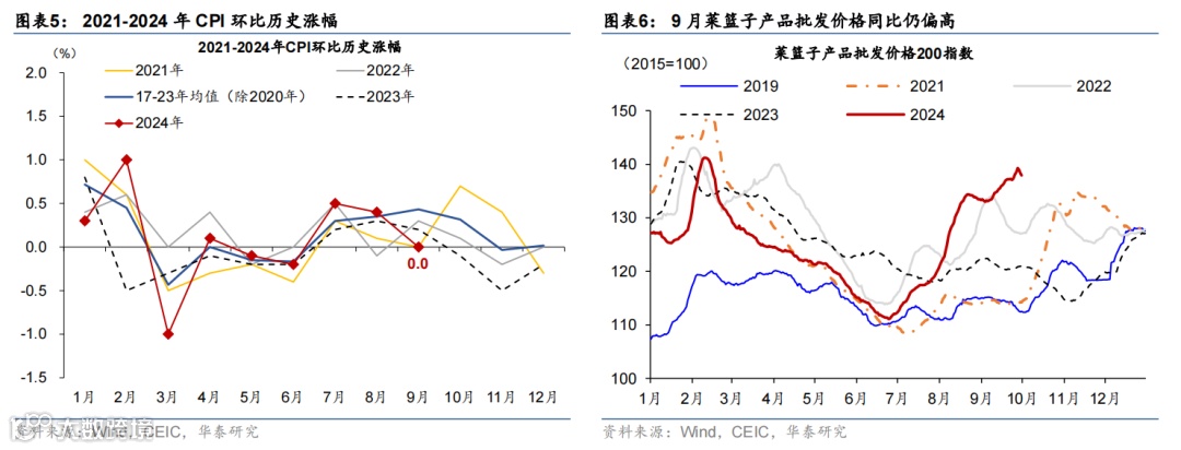 食品CPI同比较8月的2.8%上行至3.3%,提振CPI同比约0.6个百分点。其中,猪肉、鲜菜价格同比增速分别由7月的16.1%、21.8%上行至16.2%、22.9%,主要受低基数提振;而牛肉、羊肉、鸡蛋、鸡和奶类价格降幅在1.9%~13.1%之间,降幅有所走阔。环比而言,9月食品价格环比增速较8月的3.4%放缓至0.8%,其中鲜菜/猪肉价格环比增速由8月的18.1%/7.3%回落至4.3%/0.3%,主要反映8月高温多雨天气对供给侧形成的扰动逐渐消退。综合来看,9月极端天气改善推动猪价和蔬菜价格回升速度放缓,而开学季叠加中秋假期因素对食品价格仍有支撑,由此食品CPI环比增速略强于季节性水平(2019-2023年均值为0.6%)。