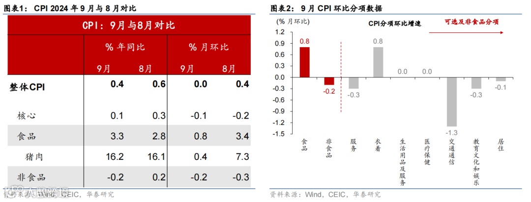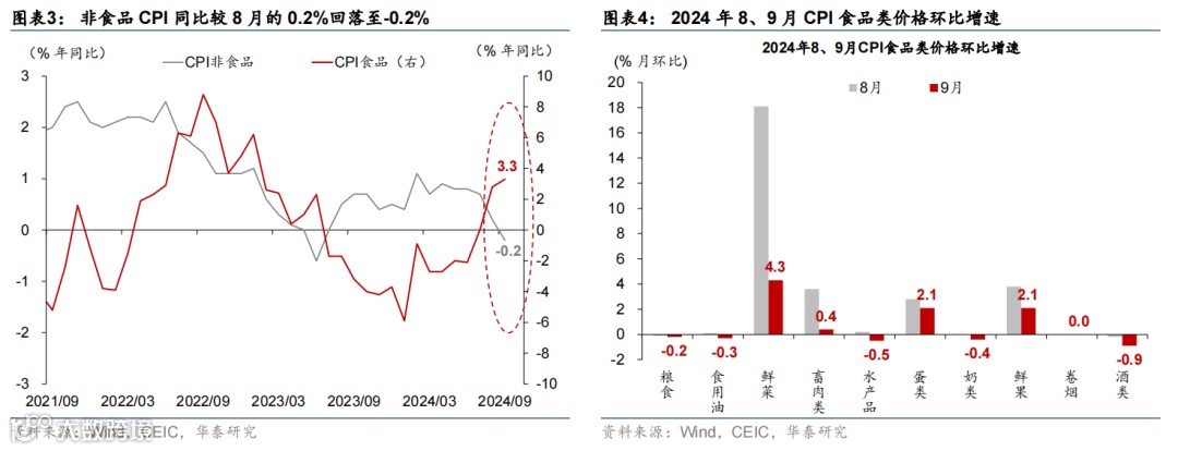 非食品CPI同比较8月的0.2%转负至-0.2%。今年中秋假期居民消费出行仍然整体呈现“量增价跌”趋势,酒店及机票价格均回落至淡季水平(参见《中秋出行消费:高频次+高性价比》,2024/9/17),交通通信分项同比降幅从8月的2.7%走阔至4.1%、生活服务同比较8月的0.2%回落至0.1%,教育文化娱乐分项同比增速亦较8月的1.3%下行至0.6%,三者合计对CPI同比的拖累较8月的0.1个百分点走阔至0.4个百分点。环比而言,非食品CPI较8月的-0.3%回升至-0.2%,分项中交通通信和教育文化娱乐环比增速较8月的-1.1%/-0.1%进一步下探至-1.3%/-0.3%,其中飞机票、宾馆住宿和旅游价格分别下降14.8%、7.4%和6.3%,主要受暑期出行结束的影响。