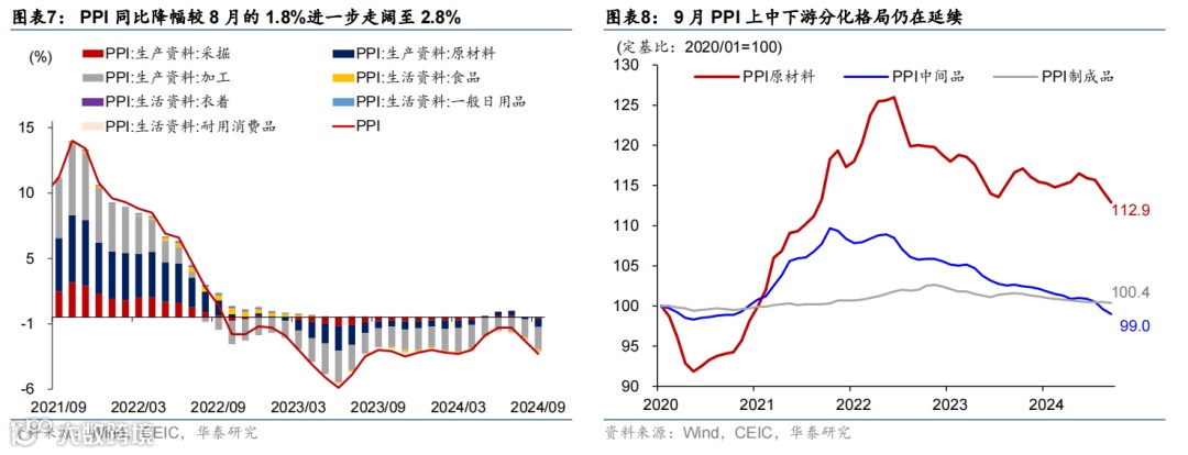 环比而言,9月PPI生产资料价格环比降幅自8月的1%略收窄至0.8%,而生活资料环比增速则较8月的0%回落至-0.1%。受国际油价下行影响、8月油气开采价格下降3.2%;煤炭开采价格环比亦较8月的-1.2%回落至-1.3%。此外,受建材需求偏弱及部分地区遭遇强风雨天气对建筑施工的扰动,黑色加工、水泥制造环比分别回落3.3%、0.8%。下游行业中,食品/医药环比增速较8月的-0.1%/0%回落至-0.2%/-0.3%;而部分新兴产业,如电子元件/工业机器人价格上升1.8%/0.6%,或反映新兴产业和传统高耗能制造业供给端景气度的分化趋势仍在延续。