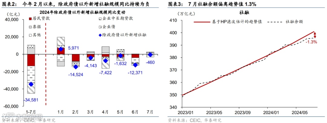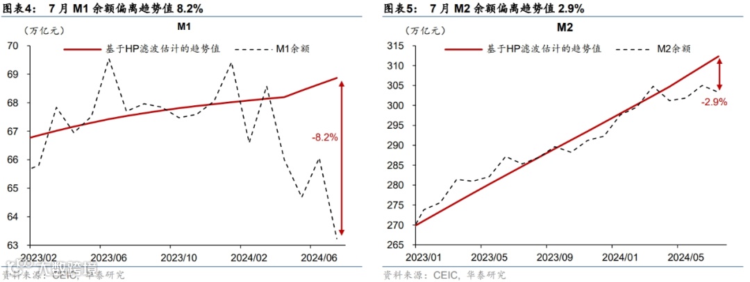 1)短期内,“挤水分”对M1和M2的影响犹存,两者仍不宜作为实体经济现金流的直接映射,其中M1受“挤水分”的影响相对较大。7月M1同比降幅从6月的5%走阔至6.6%(彭博一致预期-5.3%),月环比(非年化)降幅亦从6月的1.3%走阔至1.4%,由此M1余额偏离趋势8.2%(图表4)。虽然央行在2季度货币政策执行报告中提及,截至6月末,21家全国性银行整改“手工补息”的进度已超9成(《海外降息或打开国内政策利率下行空间》(2024/8/12)),但“挤水分”或仍对7月M1增速产生一定扰动。往前看,金融“挤水分”、以及叫停手工补息等防资金空转措施对后续货币信贷的边际影响有望较今年2季度减弱。