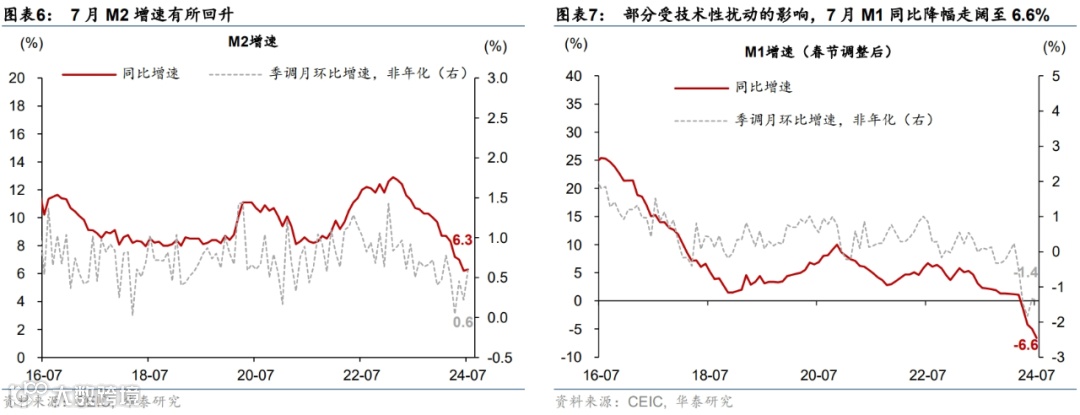 M2同比增速止跌回升,部分仍受“挤水分”和信贷扩张放缓的拖累,但受住户存款同比少减、非银存款同比多增、以及财政存款同比少增提振。具体看,7月M2同比增速从6月的6.2%回升至6.3%(彭博一致预期6%),经季节性调整后,7月M2月环比(非年化)增速较6月的0.2%回升至0.6%(图表6)。7月人民币存款余额环比减少7,972亿元,同比少减3,239亿元,其中住户存款同比少减4,793亿元,非银存款同比多增3,370亿元,财政存款同比少增2,625亿元,而企业存款同比多减2,500亿元,由此M2余额偏离趋势值2.9%。同时,7月财政存款余额环比增加6,453亿元,但同比少增2,625亿元,由此财政存款同比增速从6月的11.3%明显回落至5.1%,提振M2同比增速约0.1个百分点。