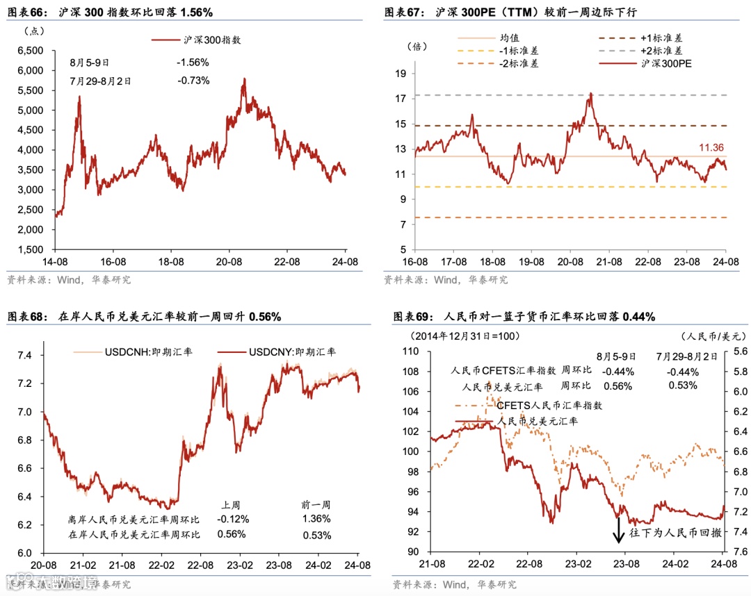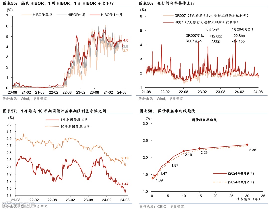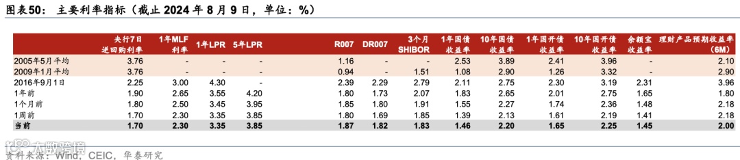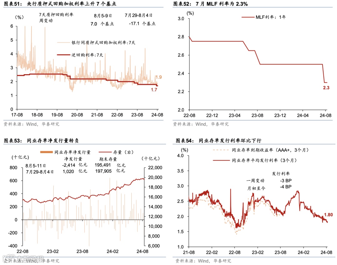 3)8月9日,中国人民银行发布《2024年2季度货币政策执行报告》,维持流动性充裕、及“多目标”框架。报告内容集中在经济运行、价格形式、货币政策、汇率政策四个方面。经济运行方面:全球经济增长动能偏弱,不同地区增长继续呈分化态势,主要经济体央行利率仍在高位。我国经济发展具有强大韧性、巨大潜力和有力支撑,一是创新动能不断累积,二是需求复苏潜力巨大,三是宏观政策有力支撑。国内有效需求不足,经济运行出现分化,重点领域风险隐患仍然较多,新旧动能转换存在阵痛。价格形式方面:市场供需关系有所改善,暑期旅游出行增加将带动服务消费需求上升,国内供需将进一步平衡。货币政策方面:完善市场化利率形成和传导机制,发挥央行政策利率引导作用,释放贷款市场报价利率改革和存款利率市场化调整机制效能,促进金融机构持续提升自主定价能力。加大优质金融服务,丰富完善货币政策工具箱,落实好防范化解房地产、地方政府债务、中小金融机构等重点领域风险的各项举措。汇率政策方面:提出综合施策,稳定预期。