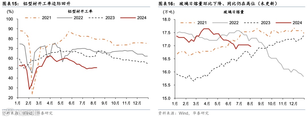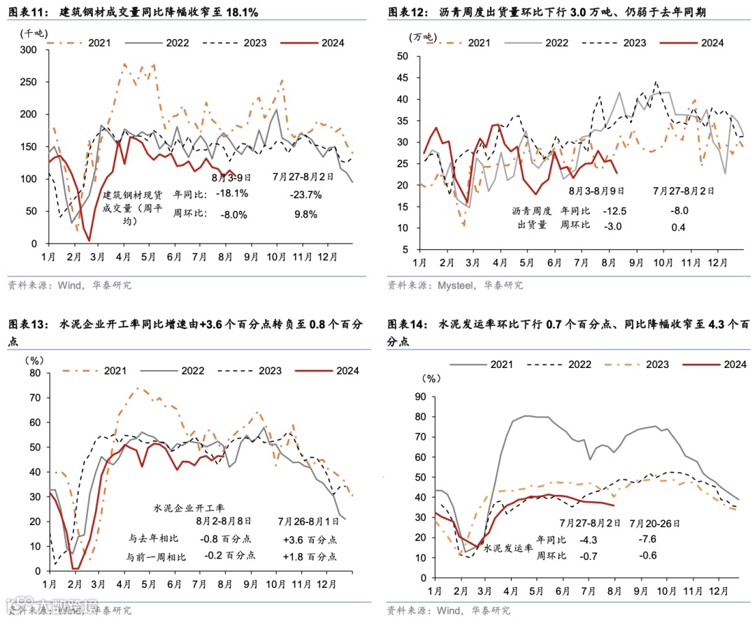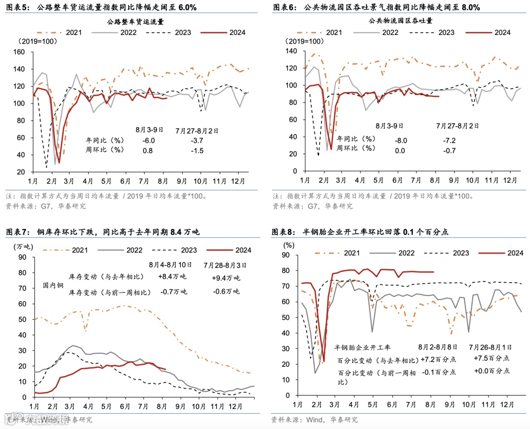 暑期出行仍维持较高景气度,商品房成交同比有所放缓,生产及投资仍受天气扰动整体偏弱,但出口增长保持较强韧性。出行方面,7月1日-8月8日,全国铁路累计发送旅客同比增长5.1%,8月1-7日,18城地铁客运量同比增速较前一周的3.7%放缓至1.6%,而拥堵指数同比降幅较前一周的1.4%走阔至4.8%。消费方面,7月29-31日,乘用车销量同比降幅收窄至1.4%,7月全月同比下降2%。出口及物流方面,整车货运/公共物流园指数同比降幅较前一周3.7%/7.2%走阔至6%/8%;8月1-10日HDET高频指标同比较7月有所回升。基建和建筑开工仍偏弱,建筑钢材成交量/沥青出货量同比回落18.1%/35.4%,铝型材/水泥开工率低于去年同期16.8/0.8个百分点。地产方面,上周新房成交面积同比降幅从17%走阔至23.2%;二手房成交面积同比较前一周的7.9%转负至-3.2%,其中一/二线城市同比增速分别从前一周的33.8%/15.5%放缓至18.8%/6.9%。