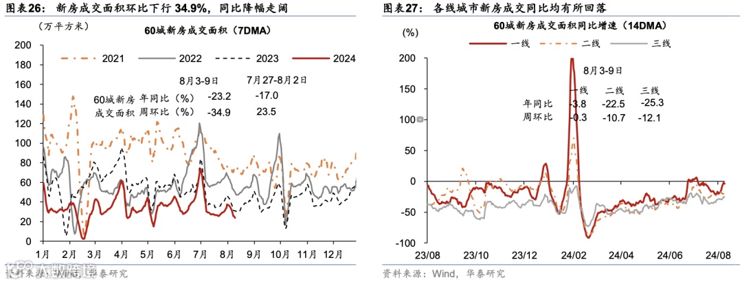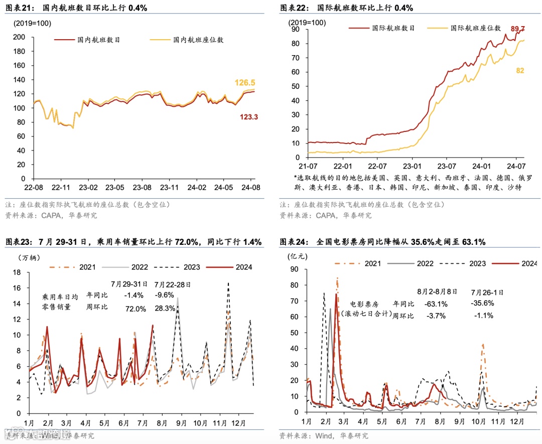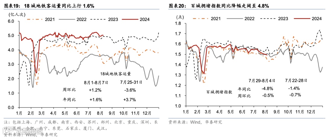 出行活动:百城拥堵指数环比持续走低、且同比仍低于去年同期;地铁出行客运量同比上行、国内/国际航班数均环比上行。8月1-7日,18城地铁客运量周环比上行1.2%,高于2023年同期1.6%、较前一周的3.7%有所放缓。此外,7月29日-8月4日,百城拥堵指数周环比下行0.5%,同比降幅较前一周的1.4%走阔至4.8%。城际/国际出行方面,国内航班数量环比上行0.4%,国际航班数量环比上行0.4%,分别恢复至2019年同期的123.3%/89.7%。此外,自暑运启动以来,7月1日至8月8日,全国铁路累计发送旅客5.4亿人次,同比增长5.1%,日均发送旅客1,386万人次,全国铁路客流保持高位运行。