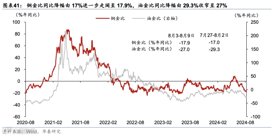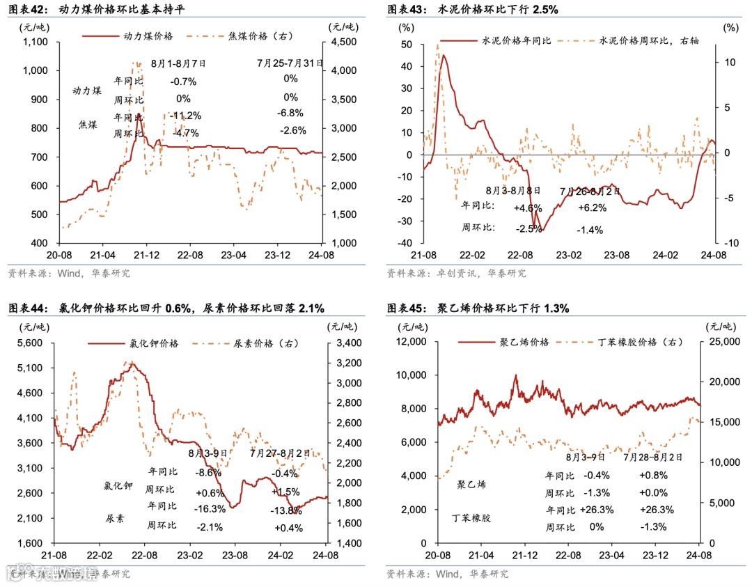 制造业:国际油价周环比低位反弹,铝铜等有色金属价格亦持续回撤。1)石油石化:8月至今,布伦特原油价格月均环比大幅回撤6.7%,上周低位回升3.7%;炼油厂开工率/沥青装置开工率月环比平均回落1.1/0.5个百分点、或显示石油石化供给侧亦偏紧。2)煤炭:动力煤价格月均环比基本持平,煤炭库存周环比回落1.7%,煤炭库存整体仍偏高、位于2013年以来的78%的历史分位数水平。3)有色金属:铝、铜和铅等有色金属价格位于80%-92%的高分位水平,8月至今均价环比整体回撤,其中铝/铜/铅价格月均环比回落4.5%/6.8%/4.2%;库存方面,上周铝库存回落3.8%、铜库存大幅上行24.7%,已回升至2013年以来83%的分位数水平,8月至今铝铜库存亦表现分化。4)黑色金属:螺纹钢价格周环比回落2.5%,需求持续回落引发黑色金属价格持续下探;库存方面,螺纹钢库存周环比回落5.6%、绝对水平自前一周32%的历史分位数水平回落至30%;5)基础化工品价格整体回落,氯化钾价格8月至今均价环比回升0.7%,而尿素/聚乙烯/丁苯橡胶价格8月至今均价环比回落5%/2.1%/2.6%。