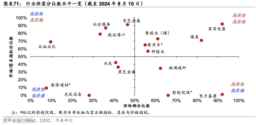 水泥、黑色金属、光伏设备和装修建材等行业所在分位数水平处于低供给、低需求区间,体现上述行业供需两侧均有所承压。通信产品、锂电池和光伏设备的价格水平仍在低位。