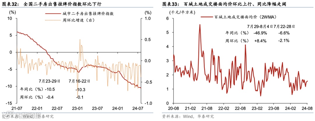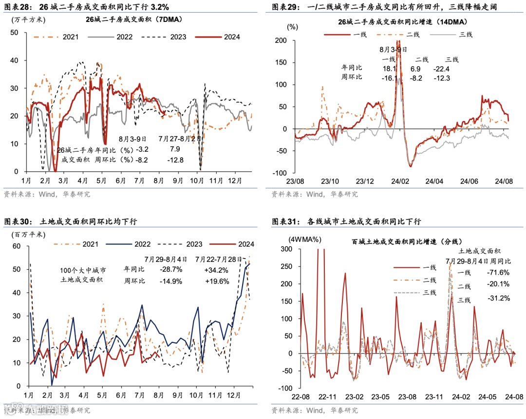 地产需求:新房成交面积同比降幅走阔,二手房成交面积同比转负。新房成交面积同比降幅从前一周的17%走阔至23.2%,二手房成交面积同比从前一周的7.9%转负至-3.2%,其中一线城市二手房成交仍维持高位,同比上行18.1%,较前一周的33.8%有所放缓。二手房挂牌价格指数环比降幅小幅走阔,而土地成交楼面均价环比回升,土地成交面积同环比均下行。