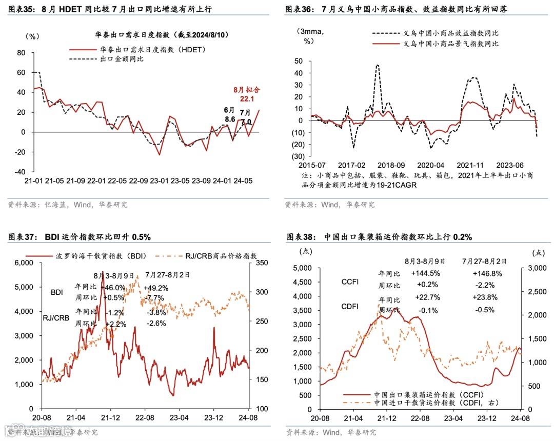 外贸需求:国际航线运价整体回升,中国出口集装箱运价指数环比上行。截至8月9日,中国进口干散货运价指数(CDFI)较前一周环比下行0.1%、同比走高22.7%,BDI指数周环比由前一周的-7.7%上行至0.5%。此外,高频指标华泰出口需求日度指数(HDET)显示8月同比有所回升。