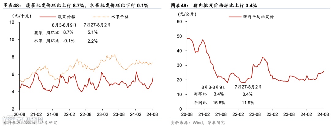 国际原油价格回升,国内原材料价格整体走低、猪肉价格持续上涨。上周布伦特原油价格环比上行3.7%至79.7美元/桶;COMEX黄金小幅回撤0.6%至2470.6美元/盎司。水泥/铜/螺纹钢价格环比回落2.5%/3.4%/2%。农产品价格指数环比回升4.4%,其中蔬菜/猪肉价格环比回升8.7%/3.4%。