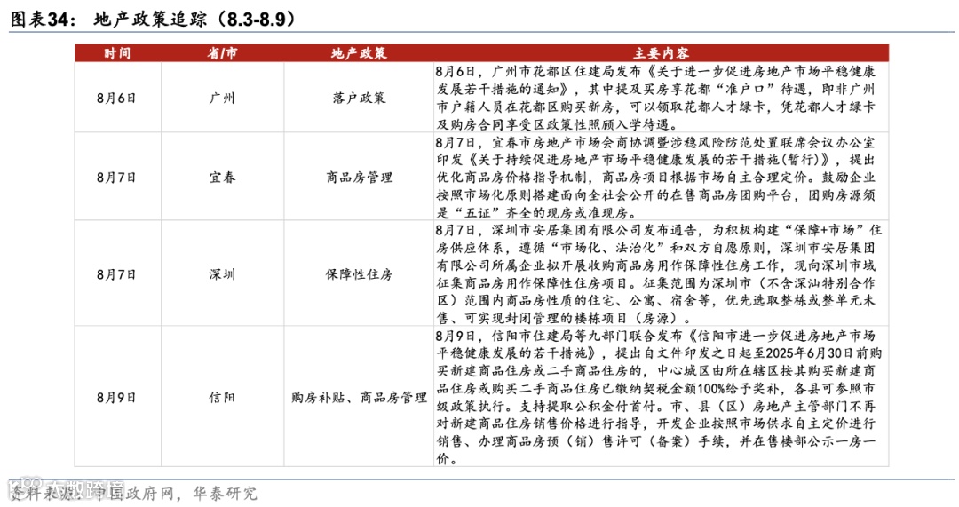 地产政策方面:1)8月6日,广州市花都区住建局发布《关于进一步促进房地产市场平稳健康发展若干措施的通知》,其中提及买房享花都“准户口”待遇,即非广州市户籍人员在花都区购买新房,可以领取花都人才绿卡,凭花都人才绿卡及购房合同享受区政策性照顾入学待遇。2)8月7日,深圳市安居集团有限公司发布通告,深圳市安居集团有限公司所属企业拟开展收购商品房用作保障性住房工作,现向深圳市域征集商品房用作保障性住房项目。征集范围为深圳市(不含深汕特别合作区)范围内商品房性质的住宅、公寓、宿舍等,优先选取整栋或整单元未售、可实现封闭管理的楼栋项目(房源)。