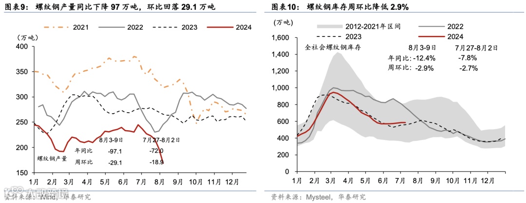 上游:上周(8月3日-8月9日)焦化开工率、高炉开工率同环比均回落。7月26日-8月1日,全国重点电厂日均耗煤同比增速上行1.3%,日均发电同比回落0.5%、降幅较前一周收窄。7月30日-8月5日,主流港口煤炭库存环比季节性回落120.8万吨、同比增加159.9万吨。8月3日-9日,全国247家样本高炉开工率环比回落1.1个百分点,同比下行3.6个百分点。焦化企业开工率环比下行0.1个百分点至65.3%,仍低于去年同期8.2个百分点。