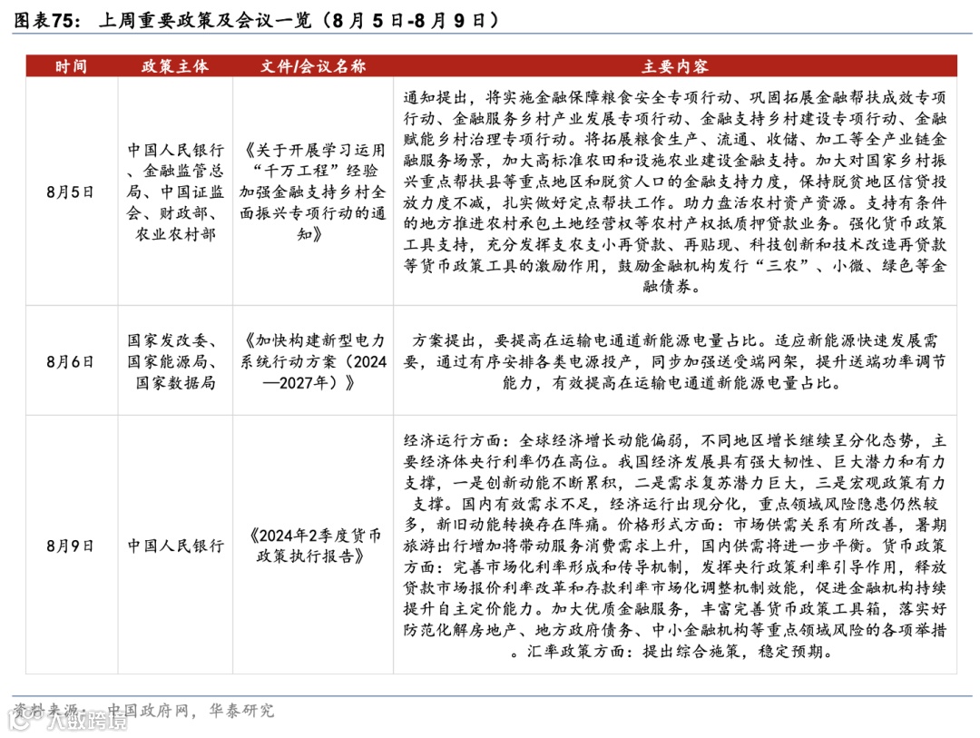 事件: 1)8月5日,央行等五部门印发通知,决定联合开展运用“千万工程”经验加强金融支持乡村全面振兴专项行动;2)8月6日,国家发改委等三部门印发《加快构建新型电力系统行动方案》,提出提高在运输电通道新能源电量占比;3)8月9日,央行发布2季度货币政策执行报告,继续强调维持流动性合理充裕、推动“多目标”货币政策框架转型升级。