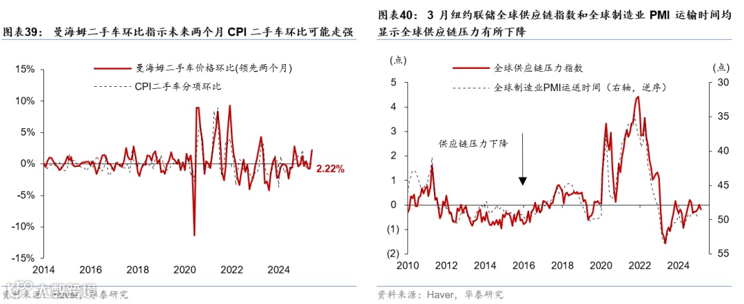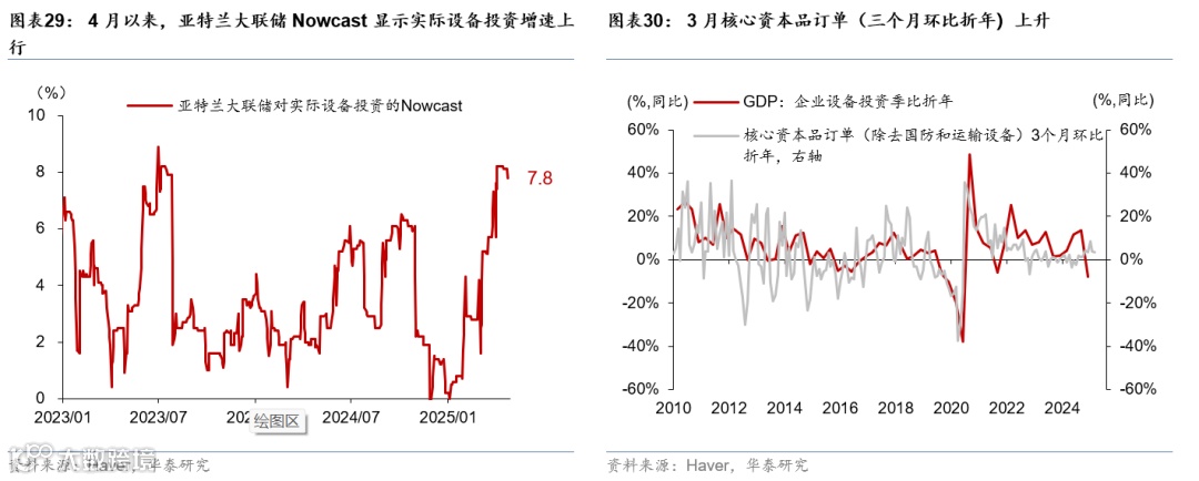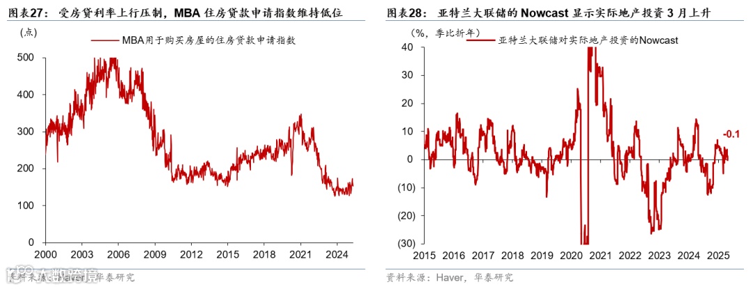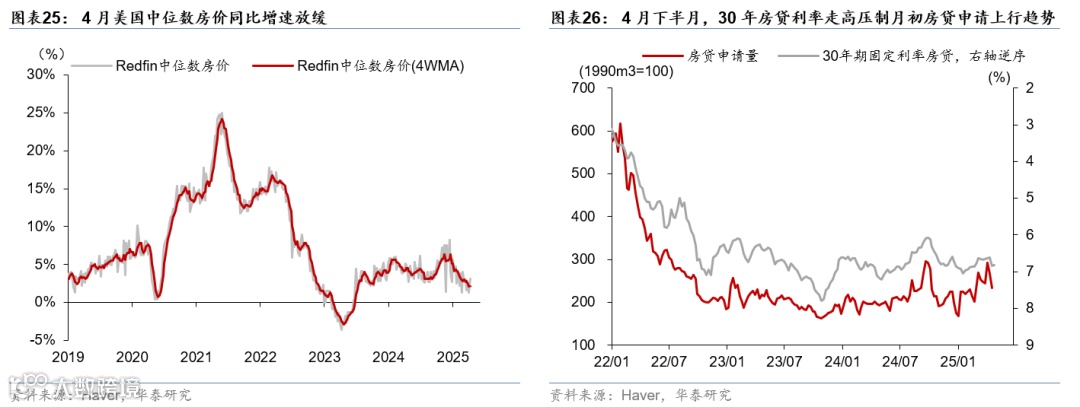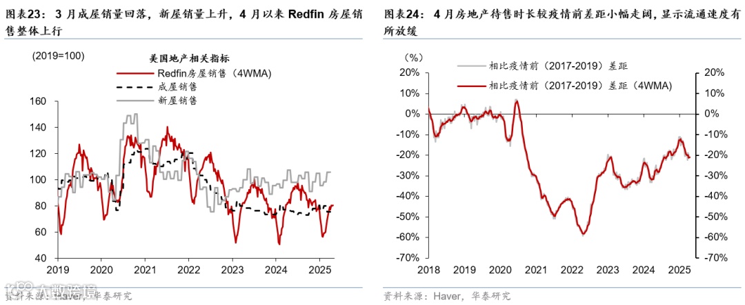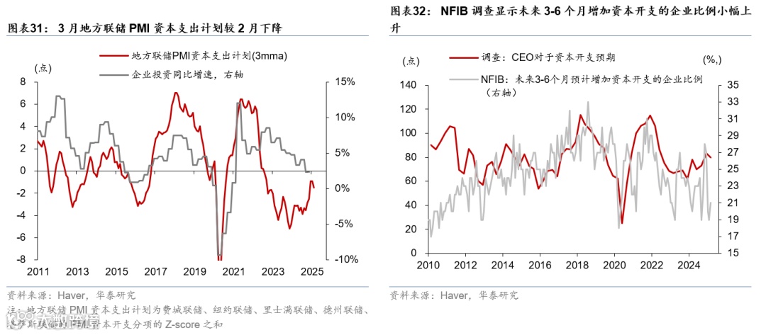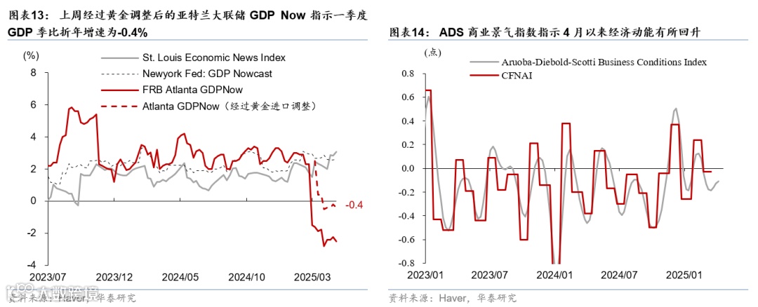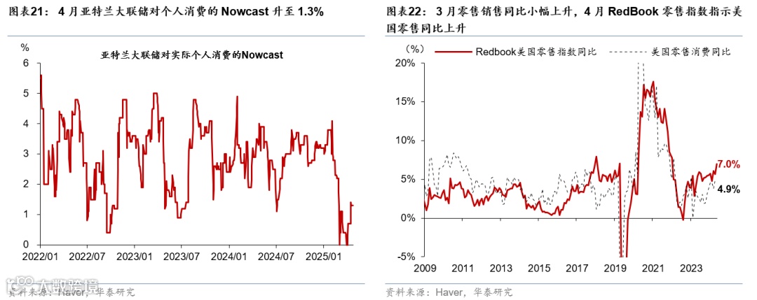 美国增长动能延续回落态势,关税导致居民提前消费推高3月零售数据,企业投资意愿继续下滑,地产需求销售整体偏弱。增长方面,美国2025年一季度 GDP增速-0.3%,抢进口导致净出口大幅拖累达到4.8pp,政府消费和投资贡献由正转负;库存投资贡献明显回升;衡量经济潜在动能的“私人消费+投资”增速3.0%。关税对4月制造业PMI影响尚不明显,4月美国Markit制造业PMI韧性超预期(彭博一致预期,下同),回升0.9至50.7,但服务业走弱拖累综合PMI降至51.2;但地方联储PMI整体表现偏弱。消费方面,3月零售消费环比由2月的0.2%大幅回升至1.4%,但主要受关税预期下汽车消费前置推动。4月Redbook零售指数同比指示4月零售同比增速读数仍将上行。投资方面,3月NFIB企业资本开支意愿仍处低位,而地方联储PMI调查中的资本支出意愿进一步大幅回落。地产方面,3月成屋销量回落,但新屋销量上升,4月以来Redfin房屋销售整体上行。