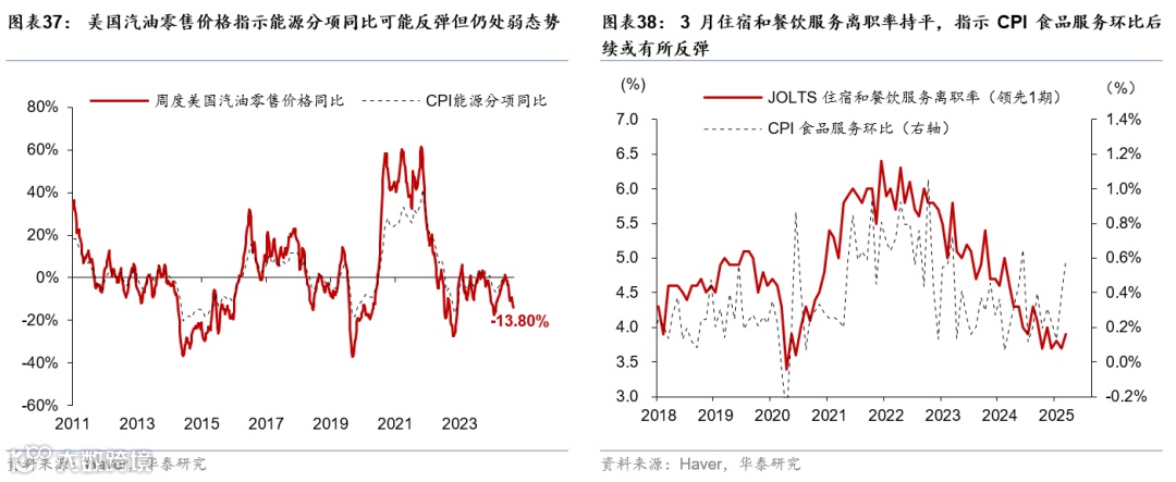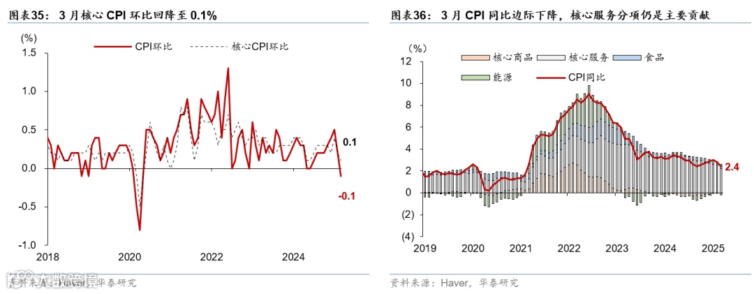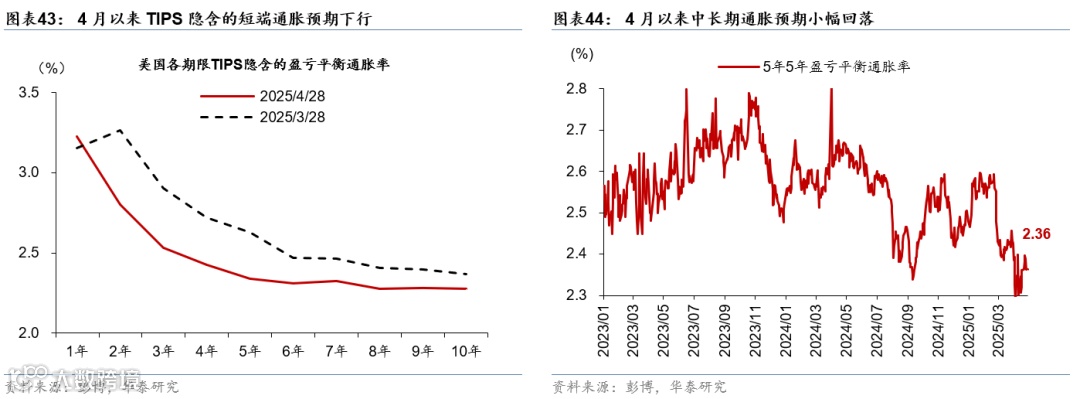美国3月通胀整体不及预期,但关税显著推高消费者通胀预期。3月核心CPI环比从2月0.23%降至0.06%,CPI环比从2月的0.22%降至-0.05%,均低于预期。分项来看,核心服务环比从2月的0.25%降至0.11%;核心商品环比从2月的0.22%转负至-0.09%,此前走高的家具和服装增速放缓。考虑到4月关税已经落地,往前看,预计关税将逐步推高美国商品通胀。从通胀预期来看,4月密歇根消费者未来5年通胀预期升至3.8%,为近30年高点,鲍威尔在3月讲话表示,密歇根消费者通胀预期为异常值,其他通胀预期调查并未明显上行; 5年5年盈亏平衡通胀率4月小幅回落至2.36%。