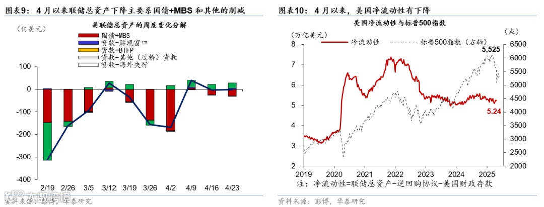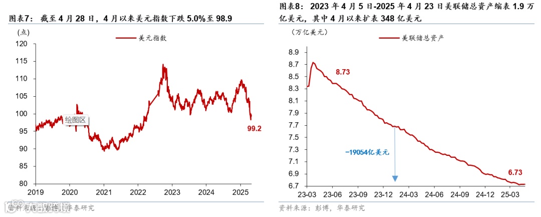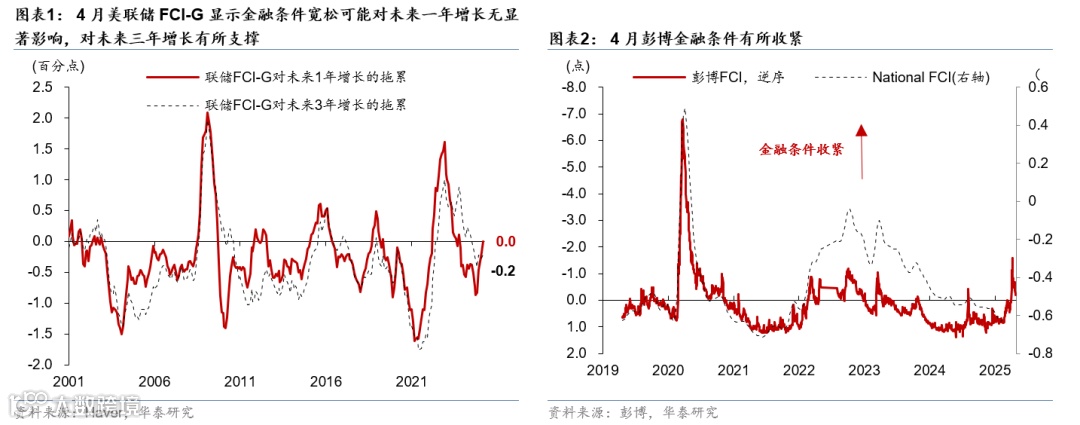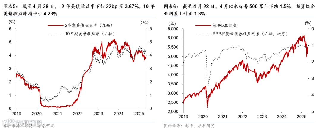 虽然股市下行、信用利差上升,但由于美元大幅走弱,高盛金融条件指数放松4bp。4月1日至28日,高盛金融条件指数累计放松4bp。股市、信用利差、短期利率、长期利率以及汇率分别贡献11bp、5bp、0bp、0bp和-20bp。具体看,截至4月28日,4月以来标普500累计下跌1.5%,投资级企业利差上行11bp至1.31%,2年美债收益率下行22bp至3.67%,10年美债收益率持平于4.23%,美元指数下跌5.0%至98.9。