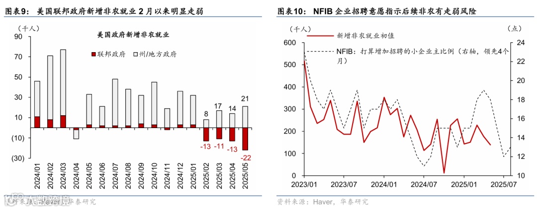5月新增非农就业高于预期或再度推后降息时点;我们维持美国经济软着陆(即在此后12个月避免衰退)的概率较高,但通胀保持粘性,维持联储9月后可能“预防性”降息2次的预测,但继续降息幅度有限(参见《不轻松的经济“软着陆”》,2025/6/3)。近期部分就业数据走弱,例如5月ADP不及预期,首申数据超预期上行,导致市场对就业市场走弱的担忧升温,5月非农报告显示美国就业市场仍有韧性,关税冲击暂不明显。前瞻指标NFIB企业招聘意愿指示,新增非农就业6月后或出现较为明显的走弱风险。就业市场有序降温,叠加通胀或在5-6月进一步回升,联储6月以及7月降息的概率相对下降。往前看,“大而美”财政预算案可能推动财政政策4季度后扩张,进一步降低短期经济衰退概率(参见《2026年美国财政赤字和美债供需压力或进一步上升》,2025/6/2)。联储可能在2025年“预防性”降息,但空间有限,我们维持联储9-12月降息2次的判断。