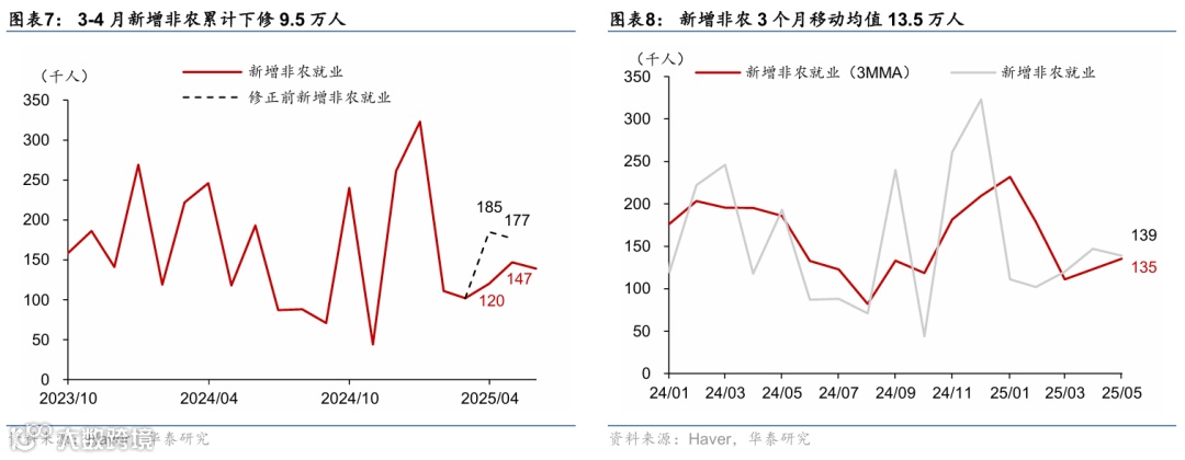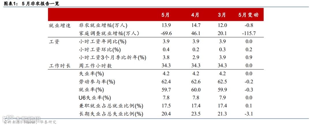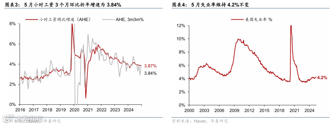 概览:5月美国新增非农就业13.9万人,高于彭博一致预期的12.6万人,此前2个月累计下修9.5万人,显示劳动力市场降温,但经济仍有韧性,软着陆概率较高。此外,劳动参与率超预期下行0.2pp至62.4%,但由于家庭就业大幅回落69.6万,失业率如期维持在4.2%;小时工资环比0.4%,高于预期的0.3%。5月新增非农有序降温,3个月均值从17.9万放缓至13.5万,但表现出一定韧性,关税的影响暂不显著。数据公布后,联储降息预期再度回撤,美债收益率上行:市场定价2025年累计降息预期下行10bp至44bp,2年期、10年期美债收益率分别上行10bp、8bp至4.02%、4.47%,美元指数走高,美股三大股指上涨。
