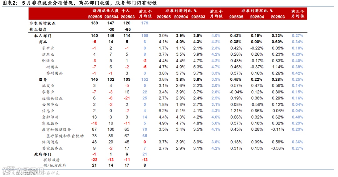 5月新增非农数据仍有一定韧性。结构上,5月服务就业表现仍有韧性,但商品部门就业明显走弱,其中制造业新增就业降至-0.8万人,为2025年以来最大降幅;政府就业特别是联邦政府就业继续回落。此外,5月薪资环比增速有所升温,部分缓解关税冲击下对就业需求明显走弱的担忧。