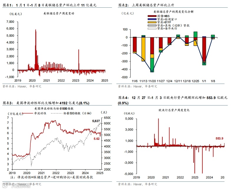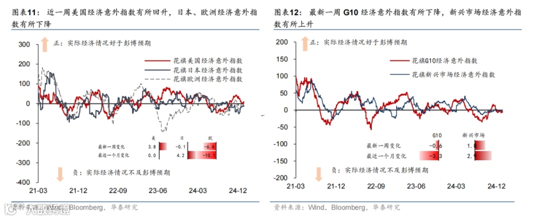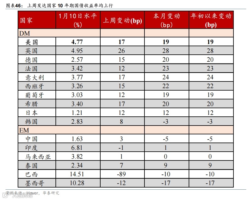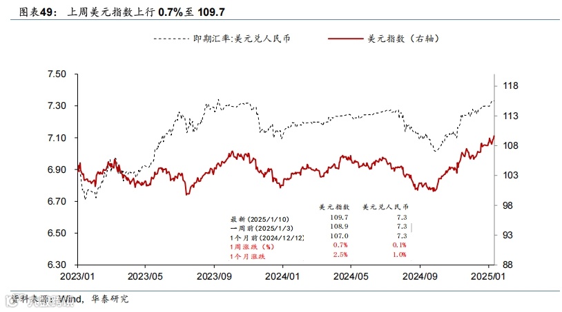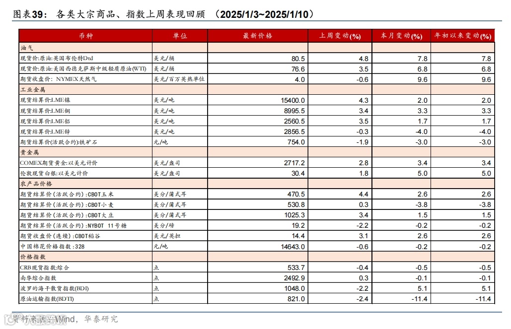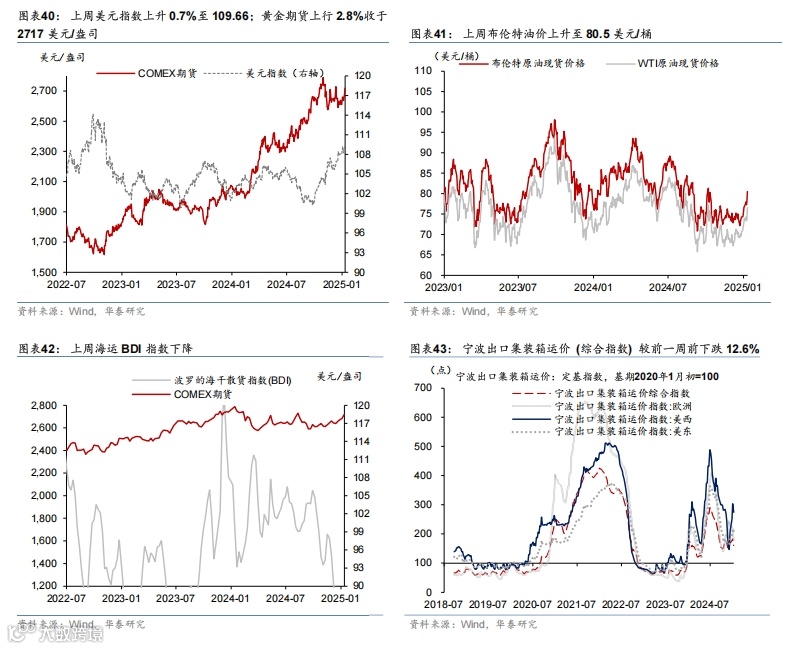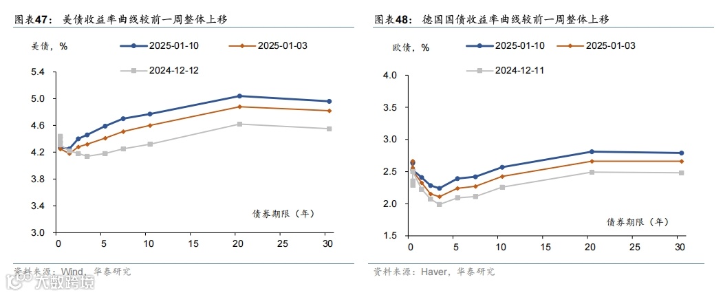 美国基本面维持强势,叠加关税风险回升,联储降息阻力加大,美债收益率和美元进一步上行,美国三大股指均收跌,大宗商品则普遍上涨。12月新增非农超预期,叠加关税风险上升,美债收益率整体上升,2年和10年期美债收益分别上升12bp/17bp至4.40%/4.77%,曲线走陡,2025年联储降息预期由前周39bp降至29bp。同期,美元指数上行0.7%至109.7;欧元保持不变;日元小幅贬值0.5%至158.4。美国三大股指均下跌,道指、标普500、纳指分别下跌1.9%、1.9%、2.3%。大宗商品普遍上涨,COMEX黄金期货上涨2.8%至2717.2美元/盎司;美对俄制裁推升油价,布伦特原油期货上涨4.8%至80.5美元/桶;LME铜现货上涨3.4%至8996美元/吨。