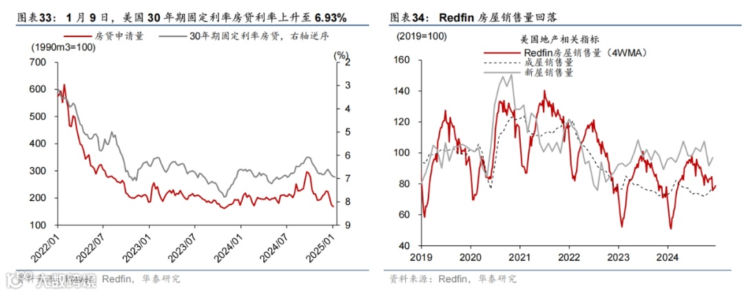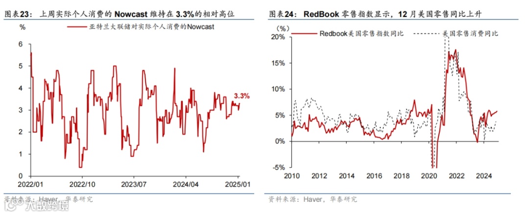 高频数据显示美国消费维持韧性,劳动力市场仍然偏强,房贷利率上行、住房需求持续偏弱。消费方面,上周实际个人消费的Nowcast维持在3.3%的高位,反映美国消费韧性仍偏强。就业市场方面,上周首申人数超预期回落1万人至20.1万人,显示就业市场维持韧性。地产方面,30年期固定利率房贷利率上行至6.93%的高位,房地产待售时长延续上行趋势、Redfin房屋销量小幅下降,房地产市场仍然承压。