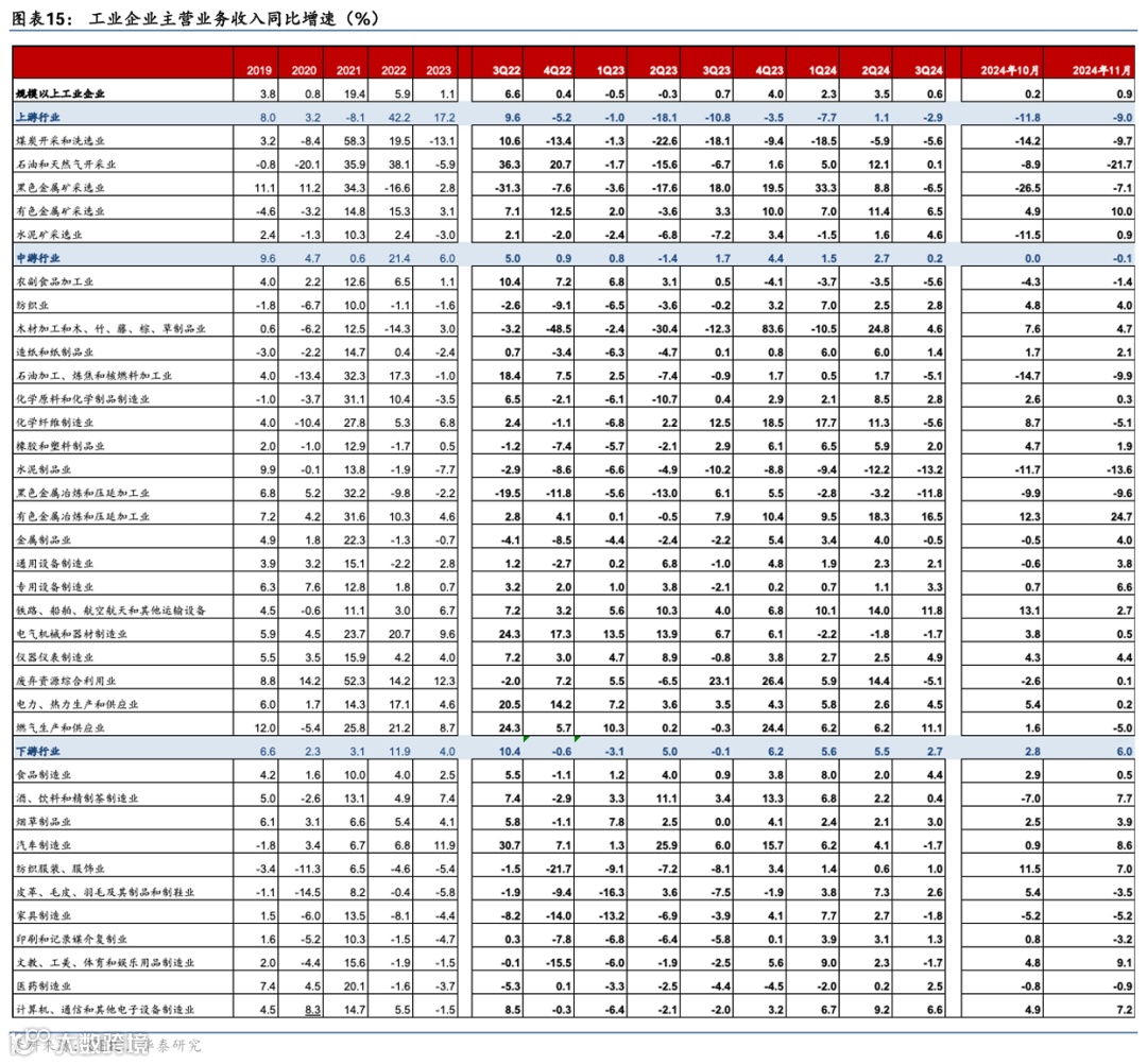 整体而言,今年1-11月工业企业盈利增速从-4.3%继续回落至-4.7%,但单月增速较10月的-10.4%收窄至-7.3%,同期PPI同比降幅亦由10月的2.9%收窄至2.5%,量价拆分来看,利润率(季调后)较10月的5.3%进一步上行至6.1%,而工业企业收入增速从10月的0.2%略回升至0.9%,显示需求温和改善,但总体仍有进一步改善空间。从结构上看,上游行业中受益于利润率改善、煤炭开采利润降幅明显收窄,中下游行业中专用设备、电气机械、钢铁等出口链行业拉动利润增长,与相应行业11月出口保持较高增速相印证,而汽车、计算机等行业或受“以价换量”特征影响、收入增速回升但利润增速有所回落。